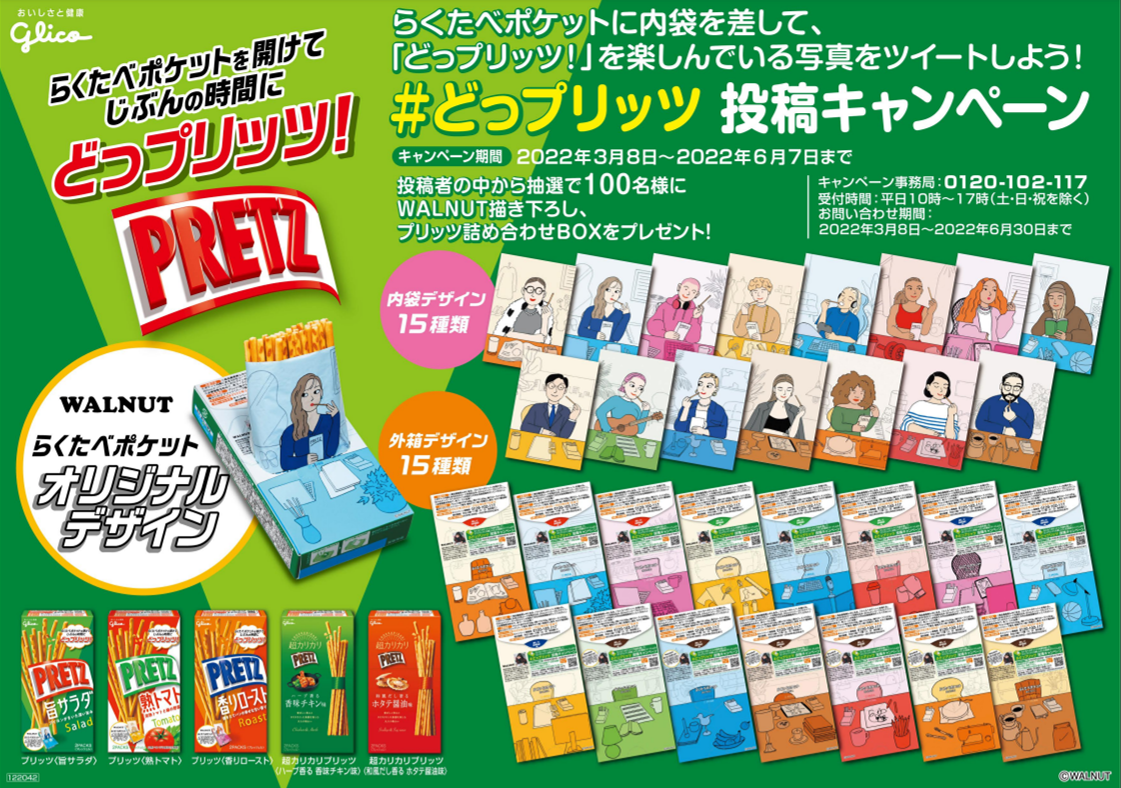 今回のWALNUT氏とのコラボパッケージ展開期間中、Twitterでプリッツ公式アカウント(@PretzJP)をフォローし、今回の限定パッケージと一緒に「じぶん時間」を楽しんでいる写真をハッシュタグ「#どっプリッツ」を付けてツイートすると、抽選で100名様にWALNUT氏が描き下ろしたオリジナルのプリッツ詰め合わせBOXがもらえるキャンペーンを実施します。