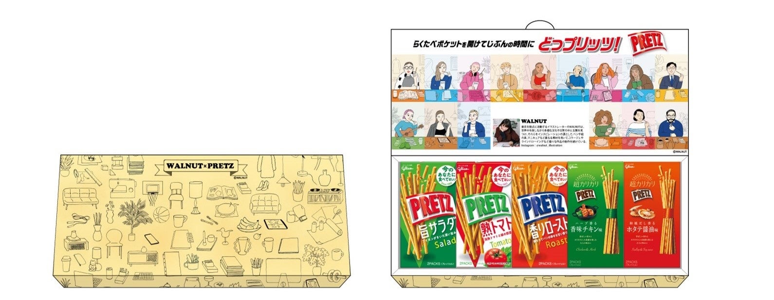 また、同日より、人気イラストレーターWALNUT氏とのコラボレーションによる「らくたべポケット」を活用した、楽しい仕掛けの限定パッケージのプリッツ(小箱5種)を期間限定で発売します。さらに、じぶん時間に活用できる景品が当たるプレゼントキャンペーンも行います。