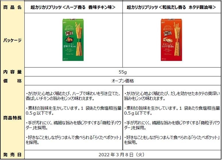 江崎グリコ株式会社は、じぶん時間を応援する「プリッツ」から、クリスピーな食感と素材の濃厚な旨みが特長的な、「超カリカリプリッツ<ハーブ香る 香味チキン味>」と「超カリカリプリッツ<和風だし香る ホタテ醤油味>」の2品を2022年3 月 8 日(火)から全国で発売します。