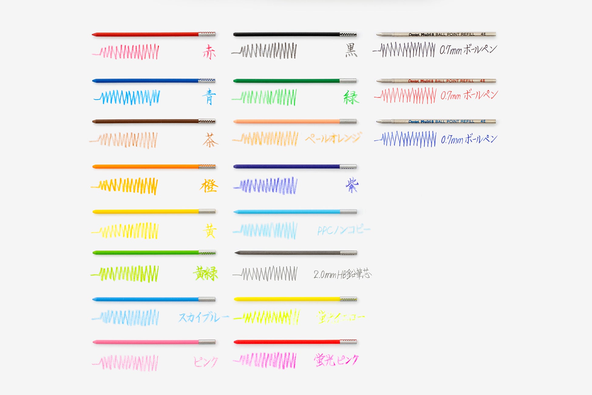 ・色芯:赤、青、茶、橙、黄、黄緑、スカイブルー、ピンク、黒、緑、ペールオレンジ、紫、