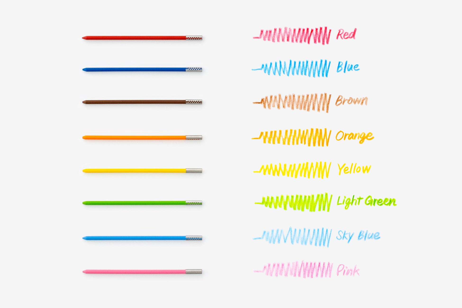 スケッチやイラストに使いやすい 赤、青、茶、橙、黄、黄緑、スカイブルー、ピンクの8色の色芯を内蔵しています。