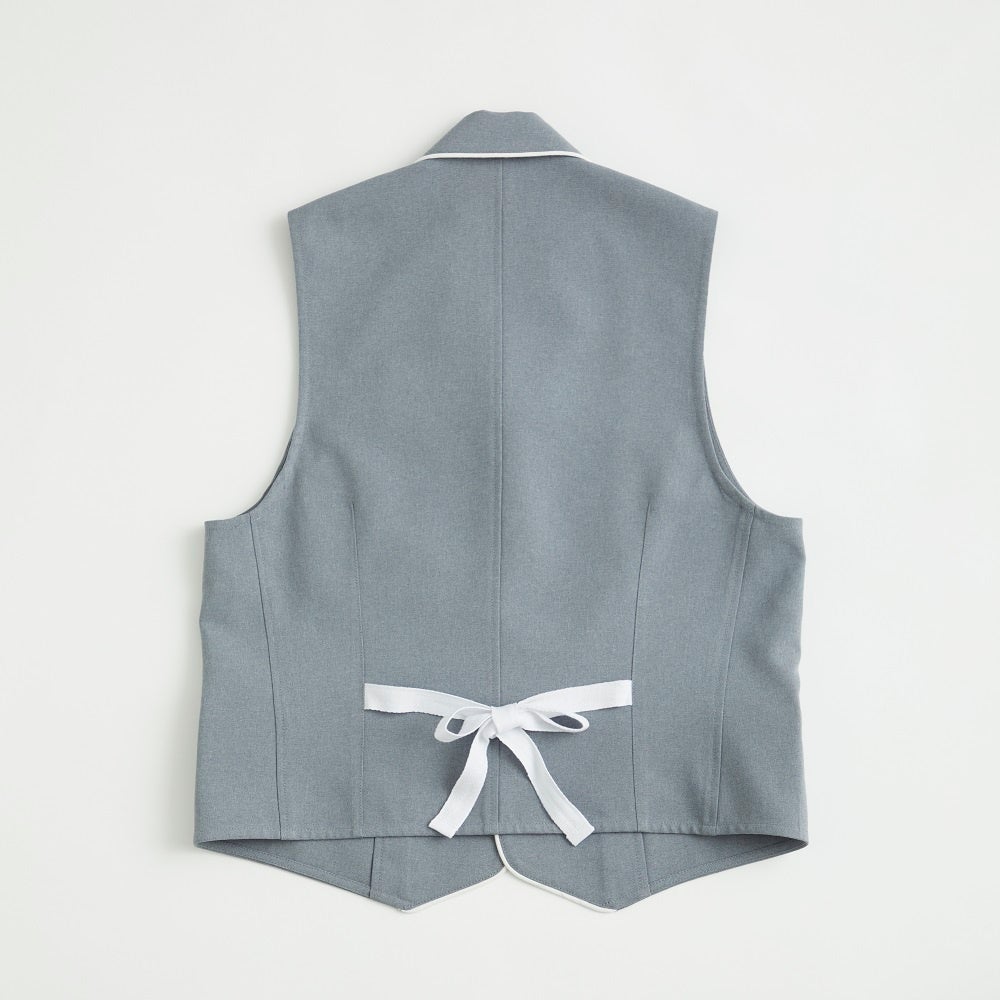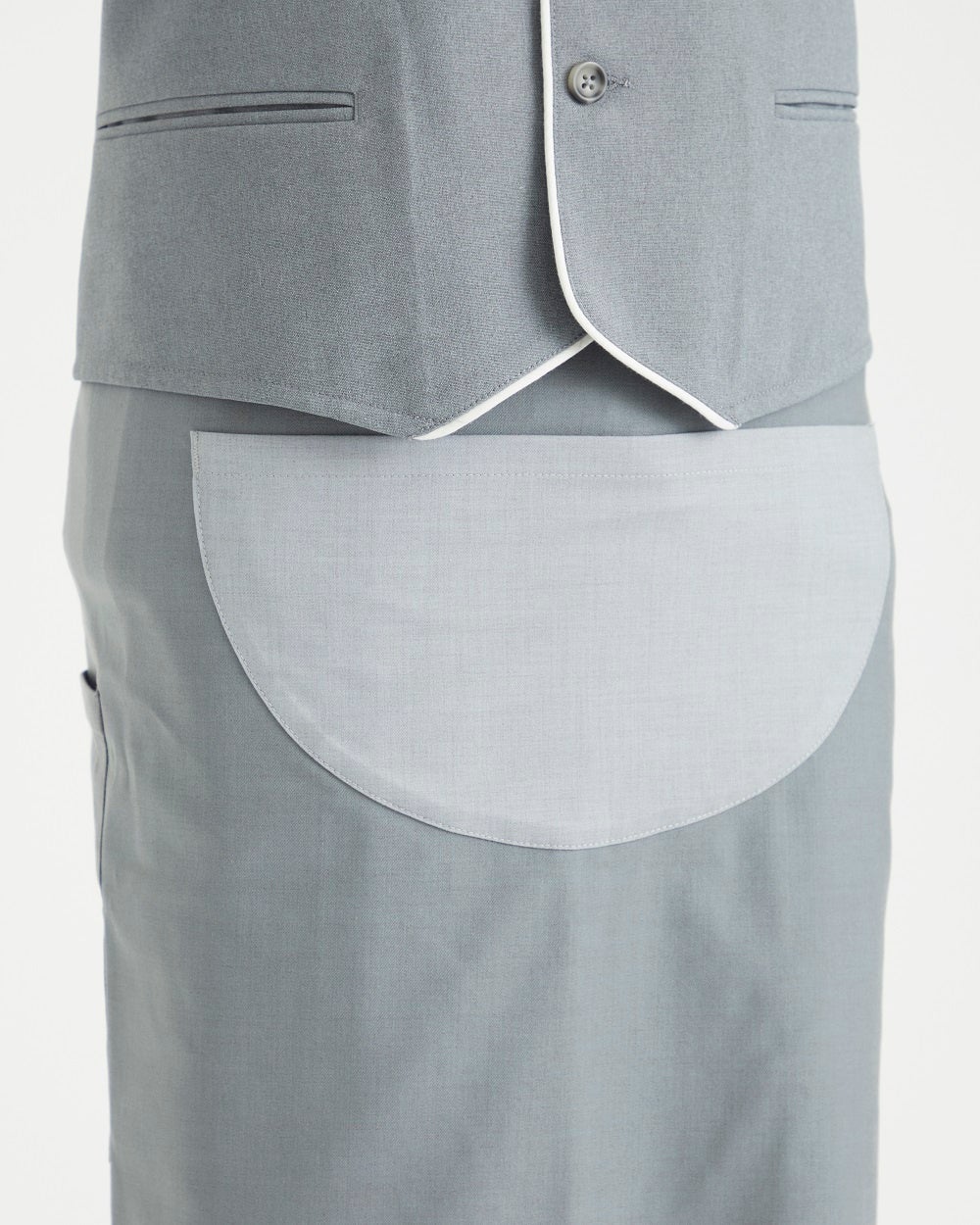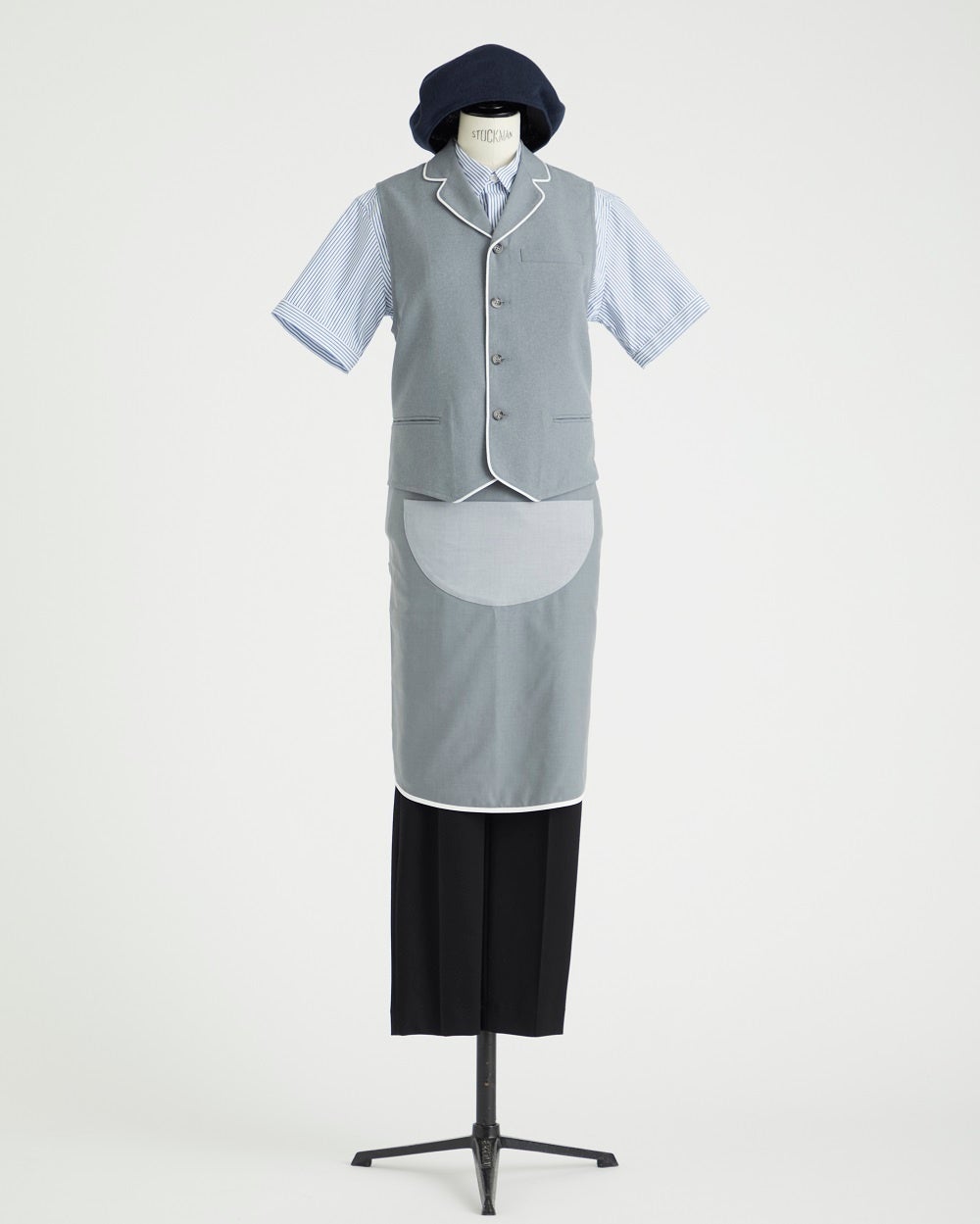 F先生の作品やキャラクターをモチーフにしたカフェのメニューはエンターテイメントそのものです。ユニフォームも仕掛けのあるデザインで楽しさを演出しました。ベストは少し丸みを持たせた狭めのVゾーンの襟できっちりしすぎず適度なカジュアル感を。背面にはサイズ調節ができるリボンが付属されています。エプロンはドラえもんの四次元ポケットをイメージしたポケット付きで、伝票やハンディ端末が入る大きさに。エプロンの形状はアーチ形で、腰に巻くと美しいフォルムが描かれます。