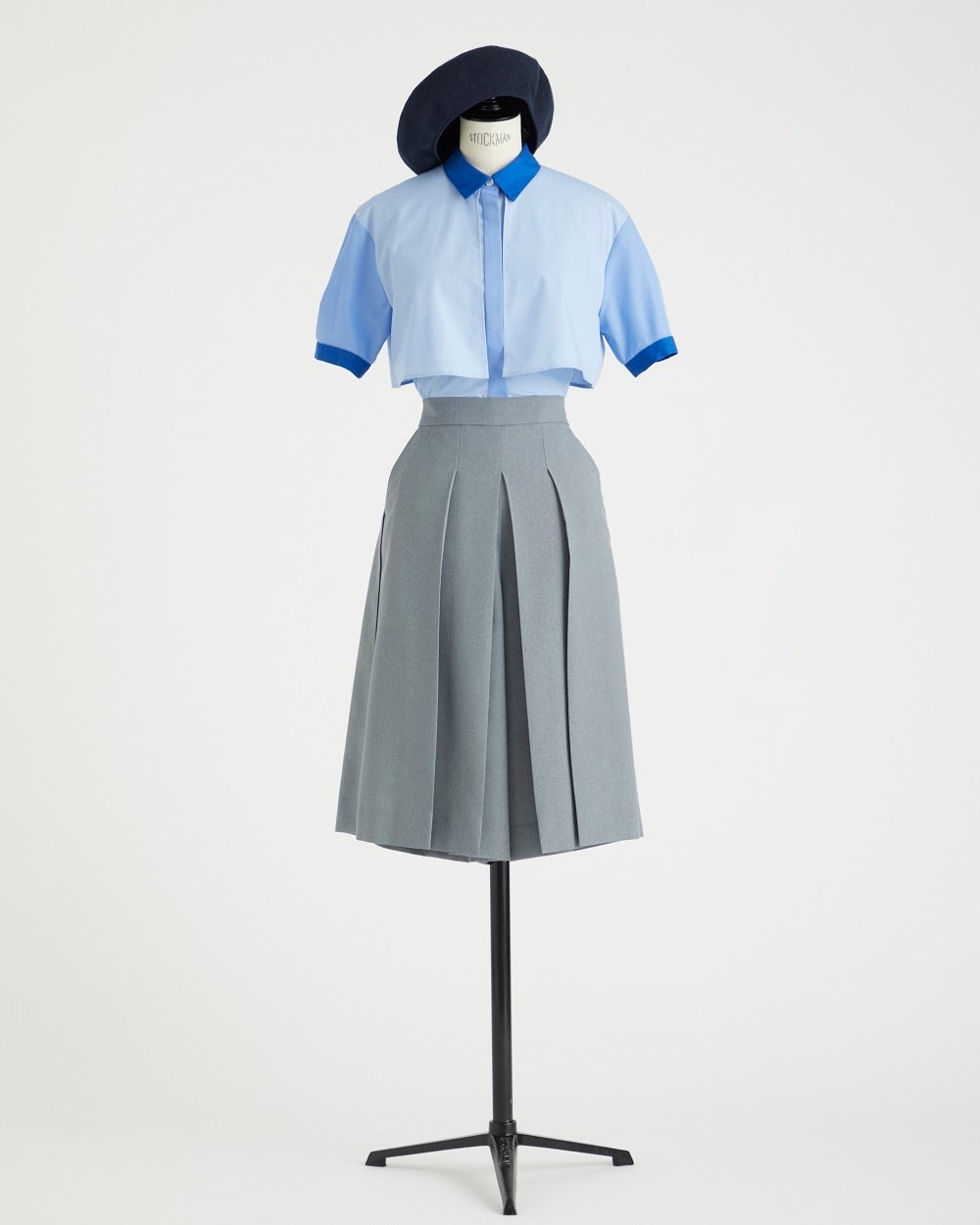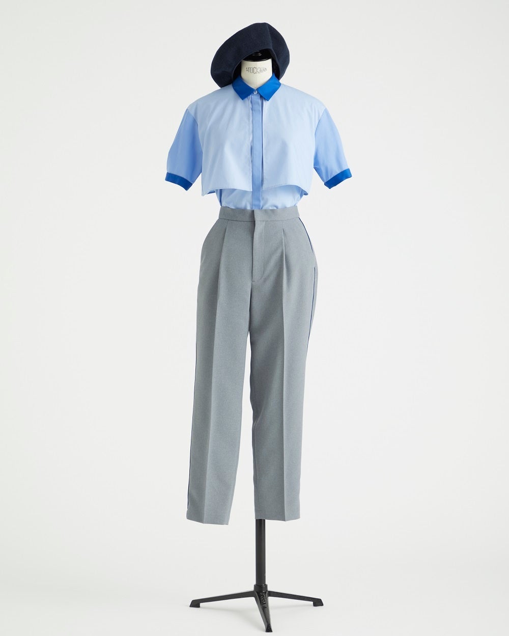 アテンドスタッフはミュージアムの顔となる存在です。接客と館内の保全を担う役割として信頼感のあるデザインを考案しました。シャツは2枚仕立てながら通気性の良い素材を採用。キュロットにはプリーツ、パンツにはタックが施され、動作がしなやかに見える工夫がなされています。ドラえもんを想起させるブルーのラインが適所に入っているのもポイント。ボトムスはスタッフご自身でキュロット、パンツのどちらかを選択できます。