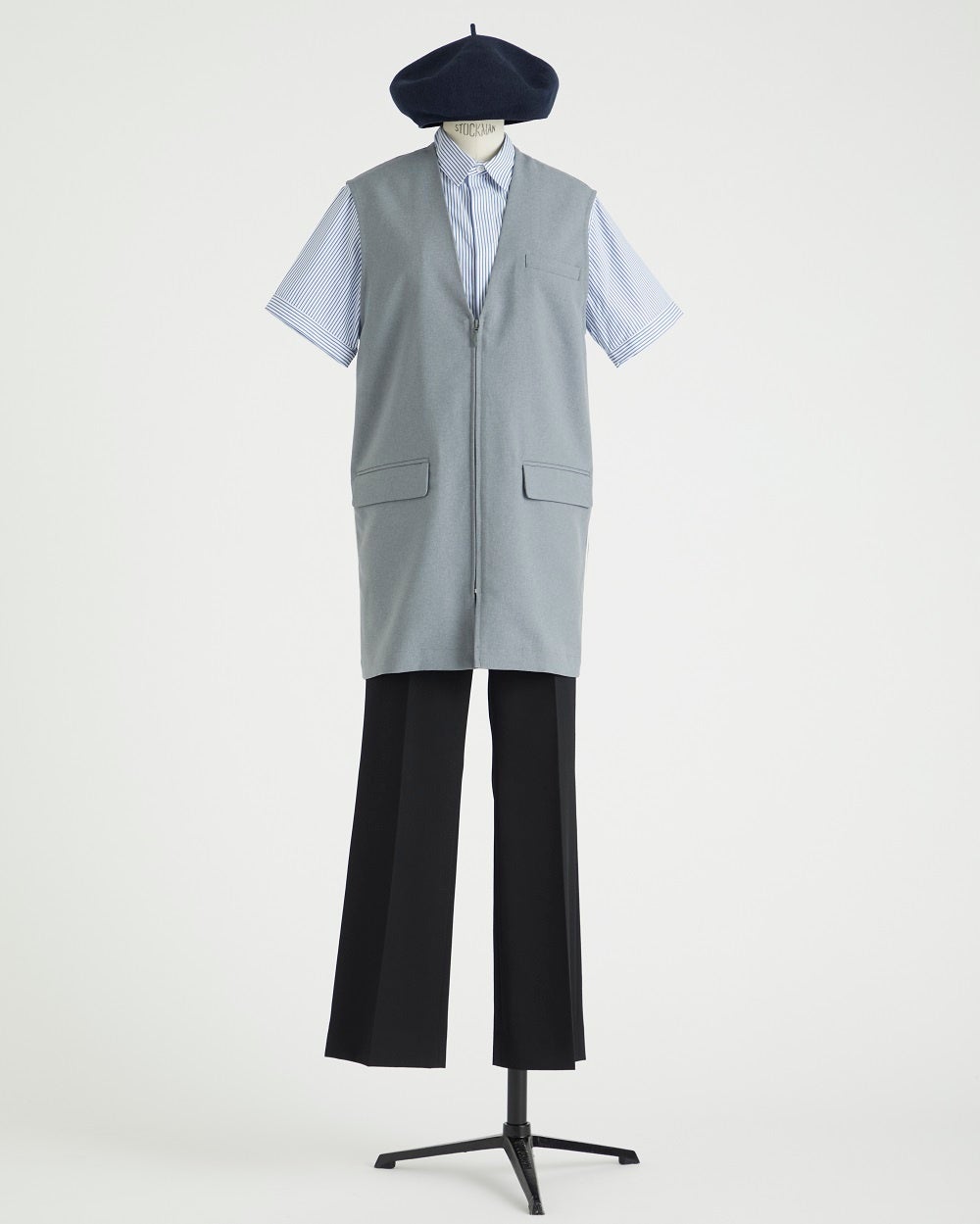 様々な種類のグッズ販売を担うショップスタッフは、専門知識と情報を持つエンジニアのような存在です。エンジニアコートから着想したワークコートは、適度なきっちり感がありながら大きなポケットを備えるなどワークに適した機能性も搭載しています。ストライプ柄ですっきりとした印象のシャツは、胸ポケットの入口をあえて斜めにカットし、F先生の作品世界を彷彿させるSF感や不思議さを表現しました。