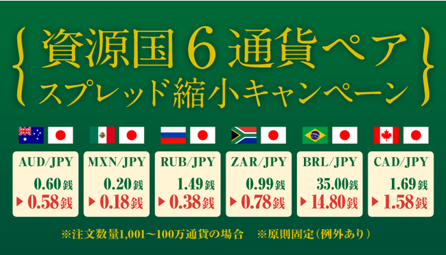 この度、昨今注目を集めております原油や貴金属等のコモディティ市場と連動性が高い資源国通貨ペアである豪ドル/円、カナダドル/円、メキシコペソ/円、南アフリカランド/円、ブラジルレアル/円、ロシアルーブル/円の6通貨ペアにおいてスプレッド縮小キャンペーンを開始いたしました。
