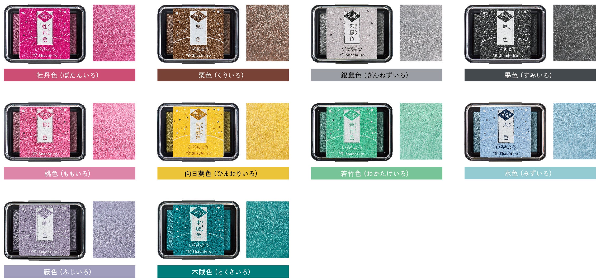 この度発売する「いろもよう 光彩」は、細かいキラキラした粒子によって、ほんのりキラめく色合いが特長のスタンプパッドです。カラーバリエーションは、日本の伝統色から選定された全10色をご用意。細かな柄も、広い面も、思いのままに美しく表現できます。キラめく上品な光沢で、消しゴムはんこやゴム印での作品づくりをランクアップしてくれます。