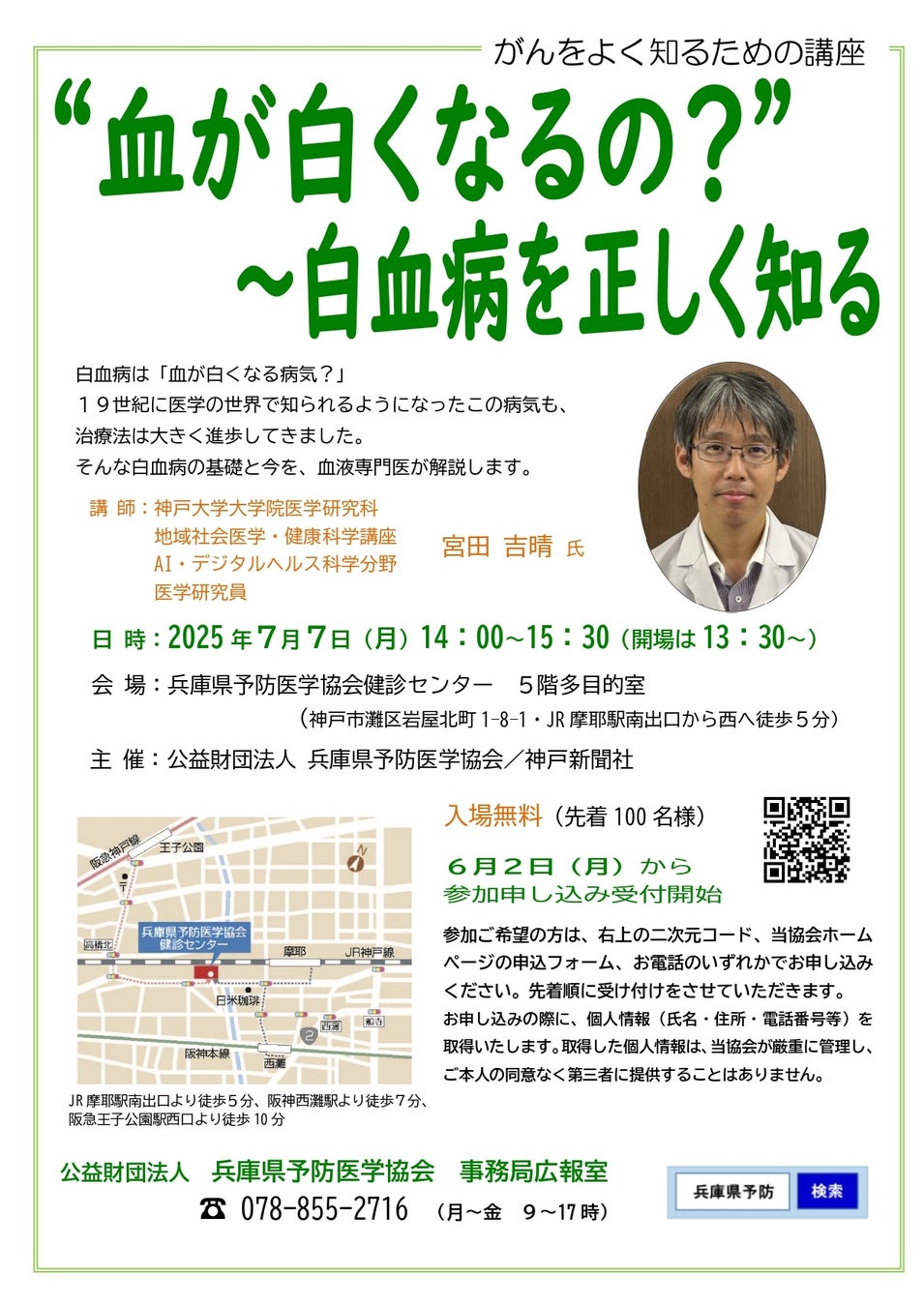 兵庫県予防医学協会と神戸新聞社の共催による「がんをよく知るための講座」を7月7日に開催します。テーマは「❝血が白くなるの?❞~白血病を正しく知る」。講師は神戸大学大学院医学研究科地域社会医学・健康科学講座AI・デジタルヘルス科学分野医学研究員で血液内科専門医の宮田吉晴さんです。
