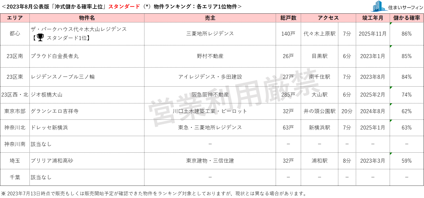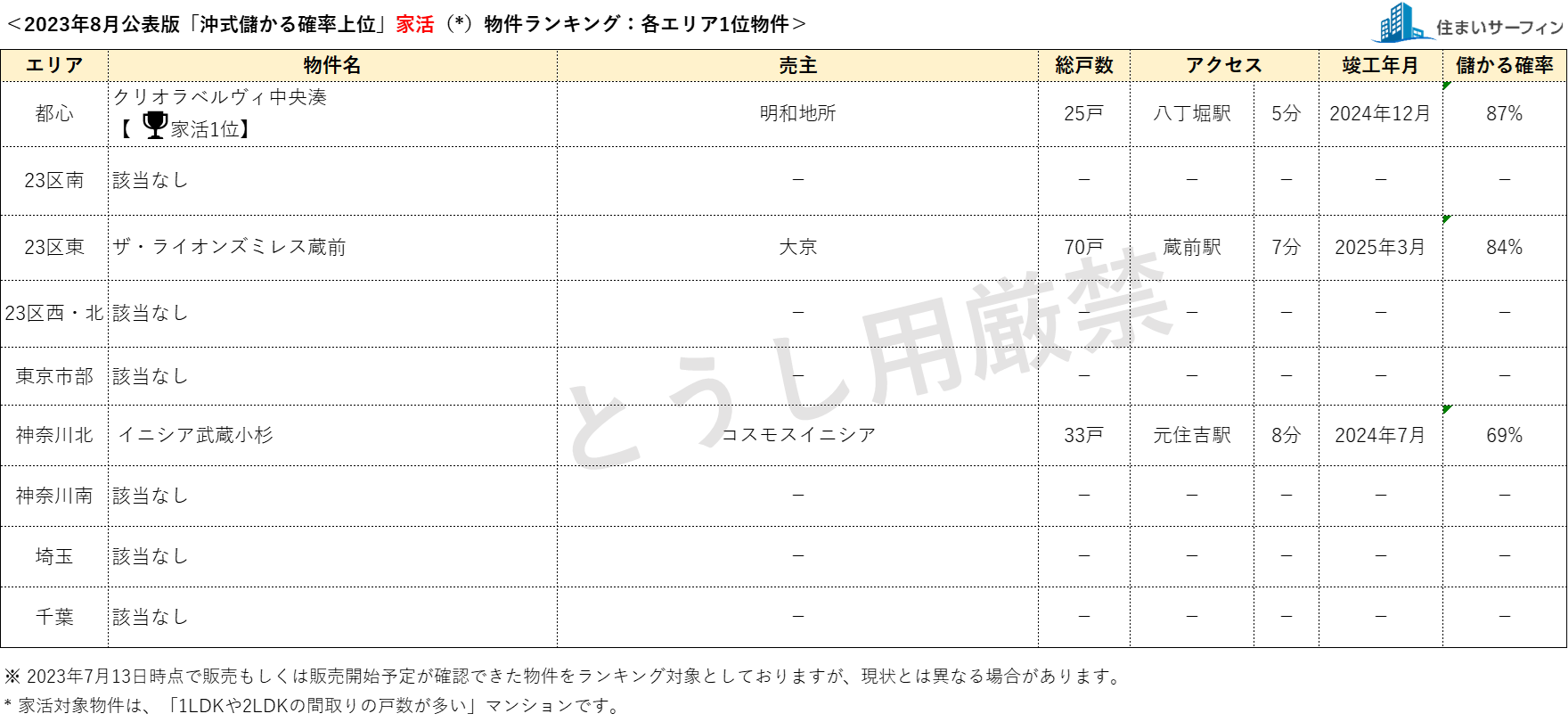 8月公表分は、2023年7月13日時点で販売もしくは販売予定が確認できた物件を対象としています。