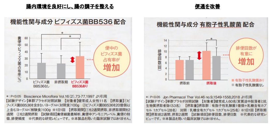 多くの女性が気にしている腸内環境。そんな悩みに応えるため、腸内環境を良好にし、便通を改善する2つの機能性関与成分を配合。