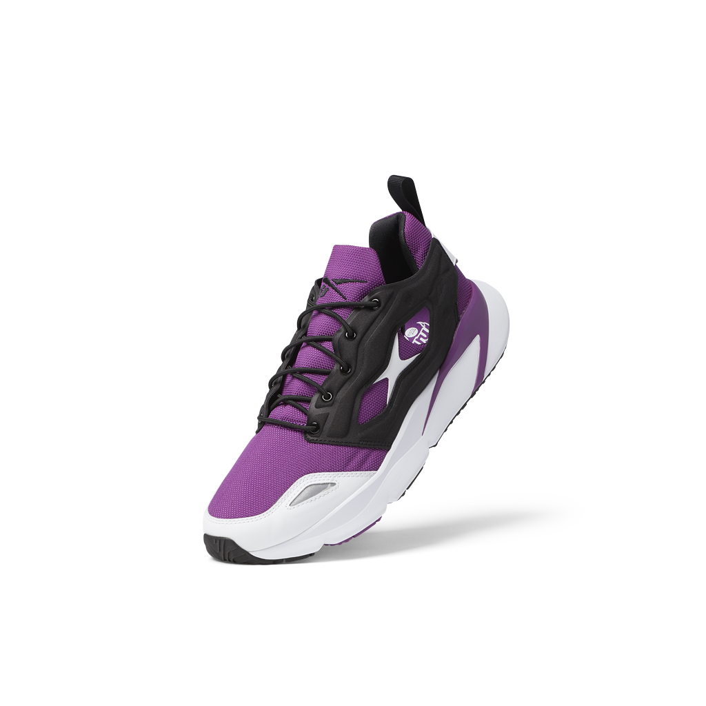 「INSTAPUMP FURY」は、“The Pump Technology(ザ・ポンプテクノロジー)”をアッパー部分に採用し、1994 年にランニングシューズとして登場した、リーボックを代表するモデルです。“ザ・ポンプテクノロジー”により、空気注入可能なチェンバー(空気室)から空気を入れ込むことで、シューズのフィット感を調整することができます。シリーズの中でも、94年モデル(前期型)と95年モデル(後期型)に分けられ、オリジナルカラーである初代“シトロンイエロー”や2代目“サックスブルー”、3代目”トリコロール”は、94年モデル(前期型)に属します。4代目の通称“パープル”と呼ばれる「INSTAPUMP FURY 95」は、当時、ランニングスタイルスニーカーブームの火付け役ともいえるシューズで、業界に革新をもたらしました。リーボックのダイナミックなデザインや革新的なテクノロジーである“ヘキサライト”を象徴し、リーボックを業界の先駆者に押し上げ、ランニングパフォーマンスとファッションスタイルを繋ぐきっかけとなった、まさに代表的なカラーモデルです。