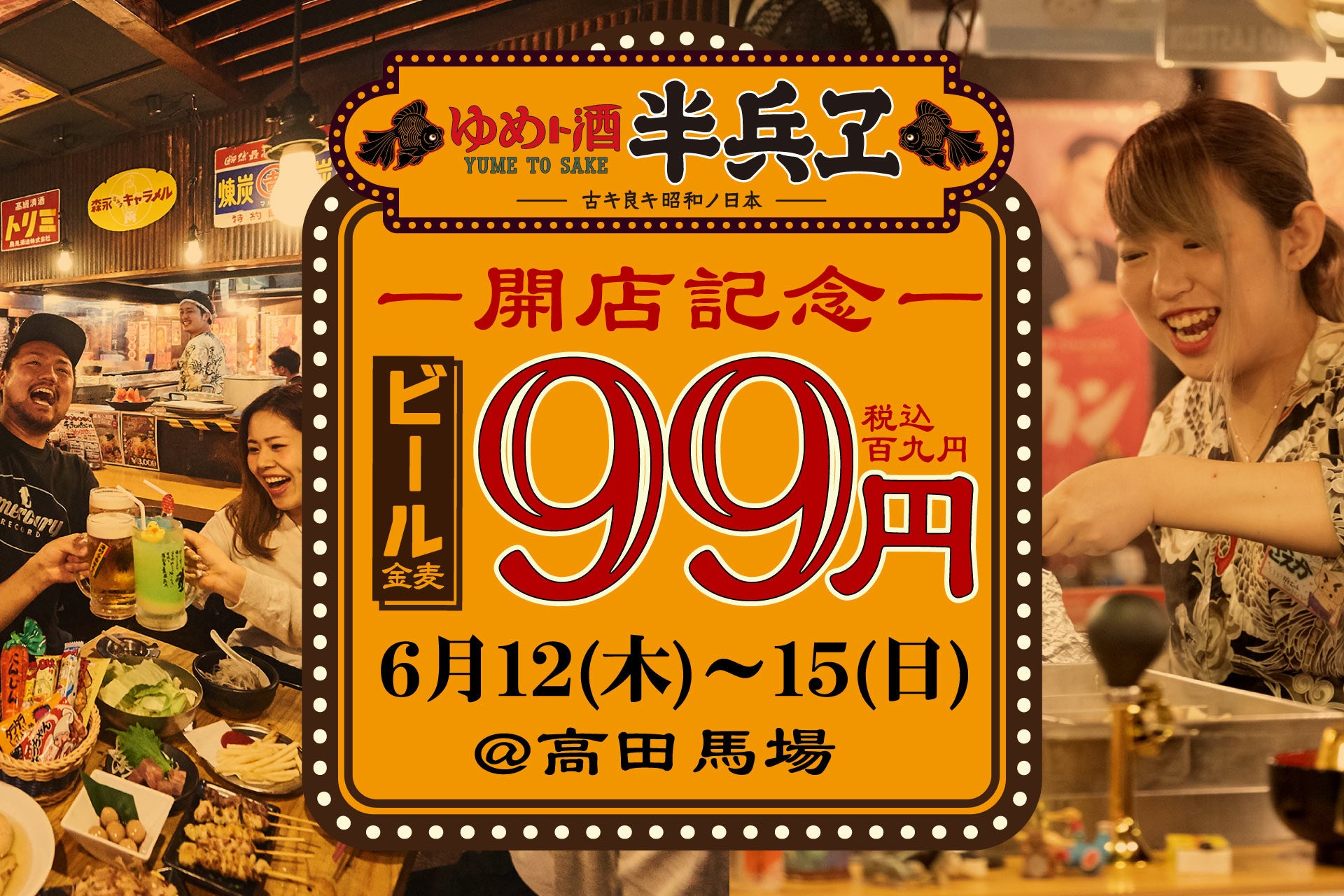 ファイブグループが高田馬場に『ゆめト酒 半兵ヱ 高田馬場店』を新規オープン!OPEN記念として6月12日(木)~15日(日)の4日間は生ビールが何杯飲んでも99円!