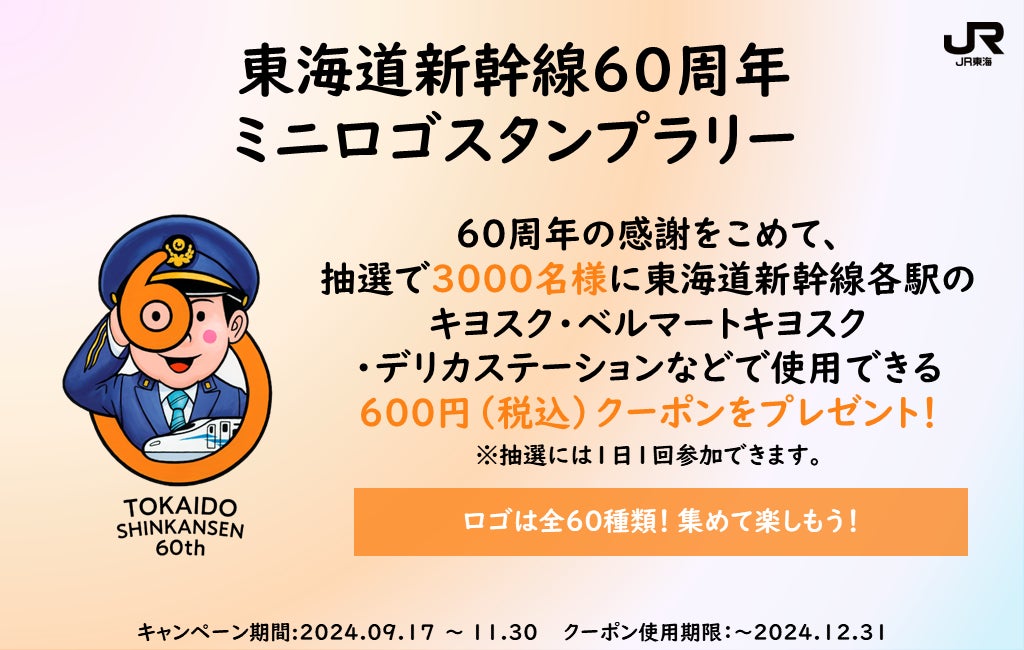 JR東海では、東海道新幹線60周年を記念して、「ミニロゴスタンプラリー」を開催しております。1日1回抽選に参加でき、合計3,000名様に、東海道新幹線各駅のキヨスク、ベルマートキヨスク、デリカステーションなどで使える600円クーポンが抽選で当たります。
