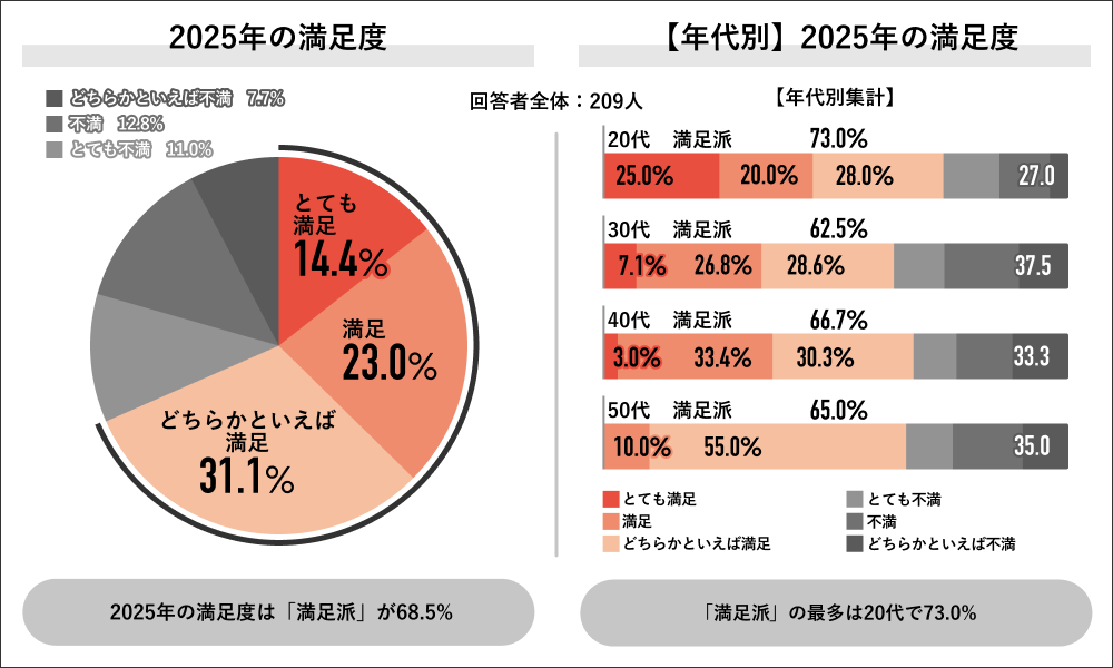 回答者全体の209人に2025年の満足度を聞くと「満足派」が68.5%で過半数を占め、内訳は「とても満足」14.4%、「満足」23.0%、「どちらかといえば満足」31.1%でした。年代別では20代の「満足派」が73.0%で最多となり、次いで40代が66.7%、50代が65.0%、30代が62.5%という結果になりました。