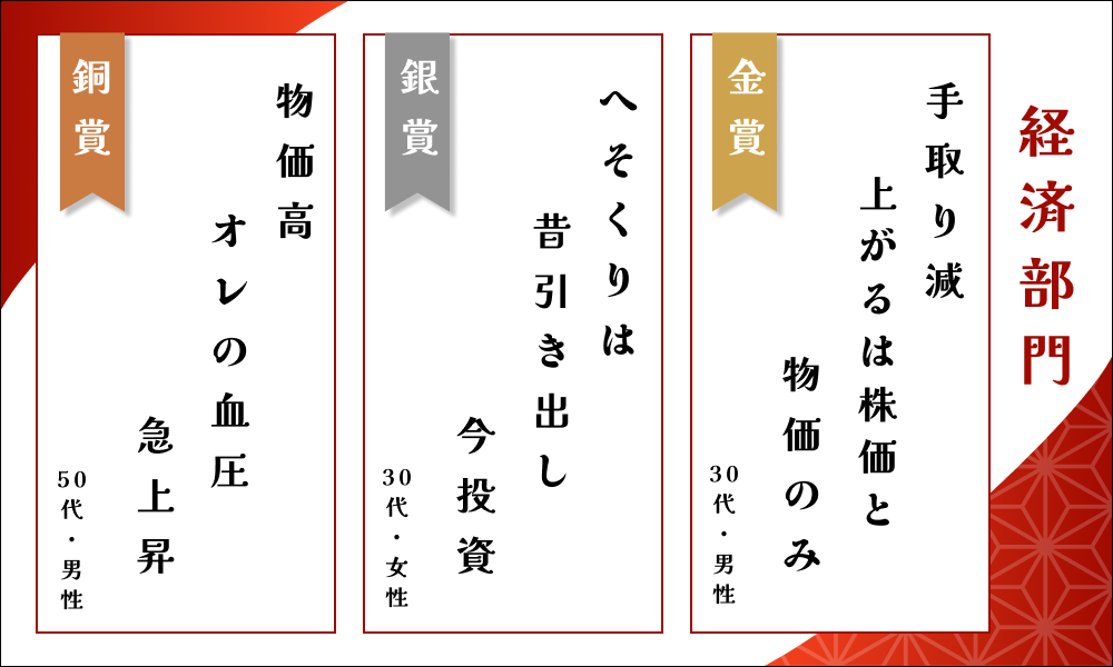 物価高の勢いは2025年においても止まず、社会人の生活に大きな影響を与え続けています。経済部門受賞作品では、物価や投資にまつわる社会情勢を反映させた作品が選出されました。