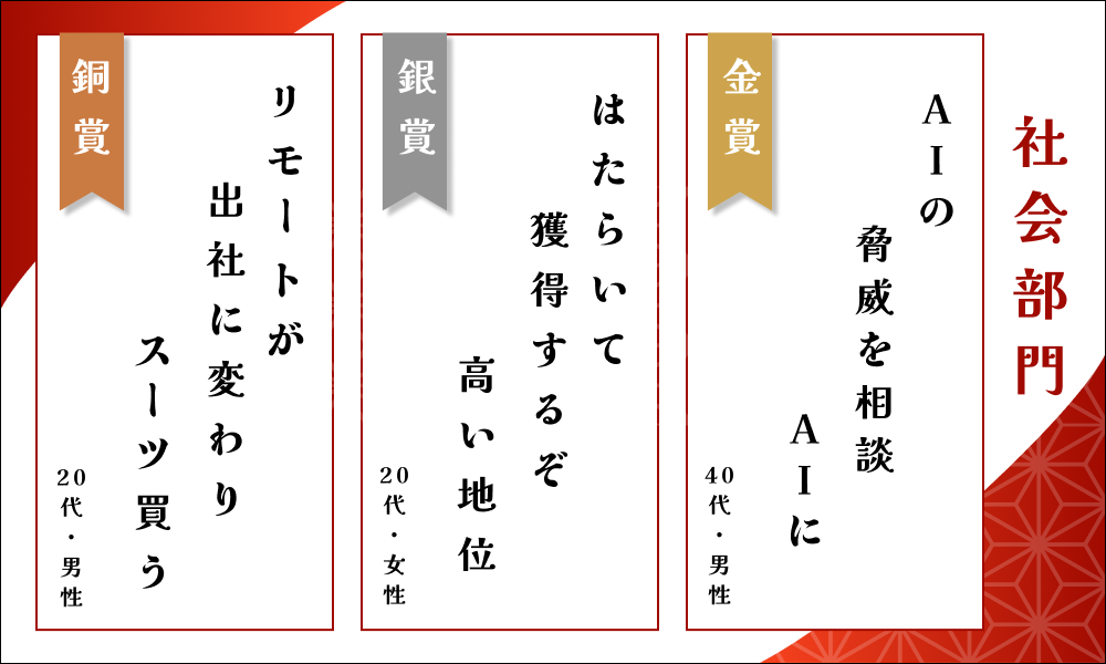 そして銅賞作品の「リモートが 出社に変わり スーツ買う」は数年間眠っていたスーツがサイズアウトしていたり、トレンドが古くなっていたりと、数年ぶりの本格的な出社に伴う戸惑いとコストを、実体験に基づいた哀愁と共に伝えています。出社回帰の動きが各業界で進み、はたらき方の再構築が行われた2025年と、2026年のオフィスの風景を予感させる一句として選出されました。
