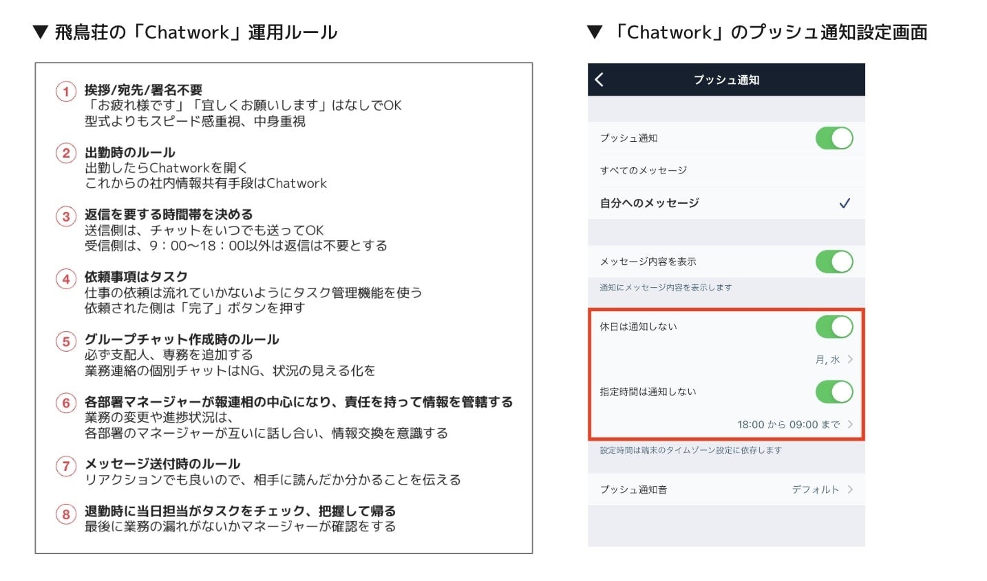 そこで飛鳥荘では、「勤務時間外は返信不要」という利用ルールとともに、この「プッシュ通知機能」の設定を推奨する運用方針を作ることで、”いつでもどこでも連絡ができる”というチャットの利点を活かしながら、従業員の働き方にも配慮した形で運用することができるようになりました。