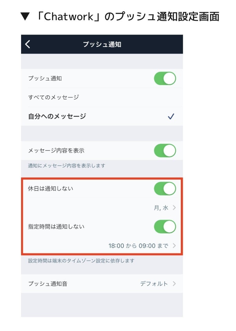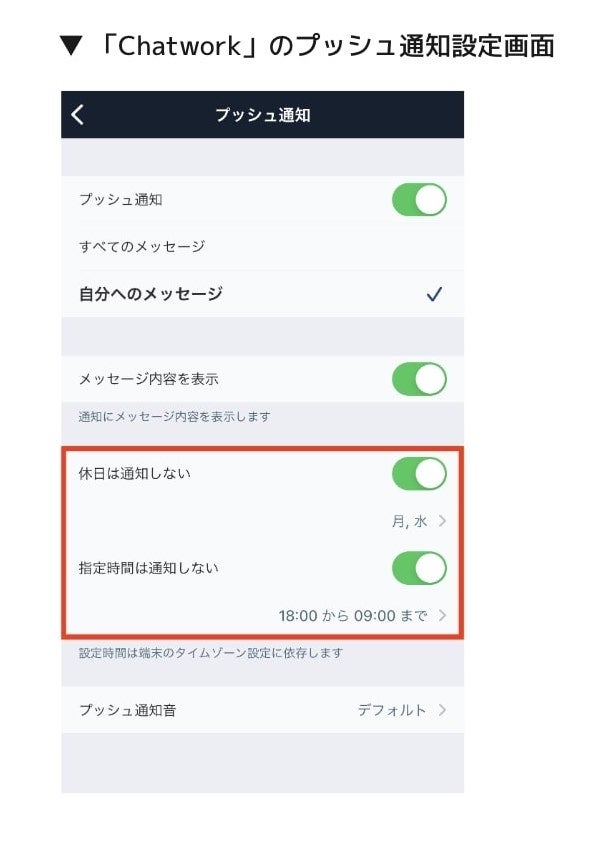 「Chatwork」では、スマートフォン用の「プッシュ通知機能」設定を変更することで、任意の曜日・時間の通知をOFFにすることができます。