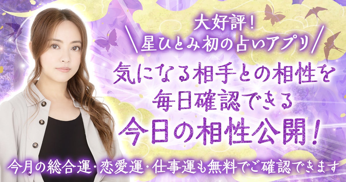 通常であれば月額占いサイト「星ひとみの占い―5秒で見抜く宿命と刻」に登録しなければ見られない「今日の総合運」「今月の総合運・恋愛運・仕事運」をアプリ内で体験できます。また、気になるあの人との「今日の相性」もご確認いただけます。