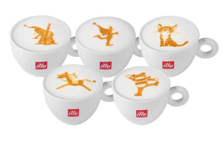 2025年10月22日(水)~2026年1月4日(日)の展覧会開催期間中、会場入口に隣接するカフェラボでは、藤城清治さんの影絵作品のキャラクターを描いたカプチーノを販売します。藤城作品の代表的なキャラクター「こびと」「ケロヨン」をはじめとする全5種の絵柄から選べるイタリア・イリー社のエスプレッソ豆を使用した本格カプチーノです。展覧会とともにカフェラボで作品の世界観をお楽しみください。