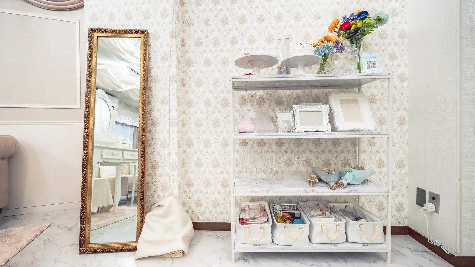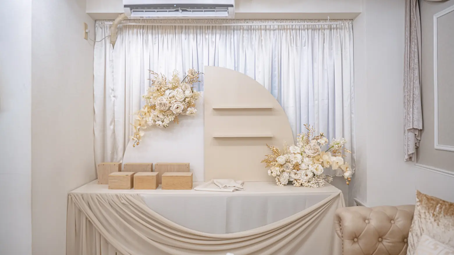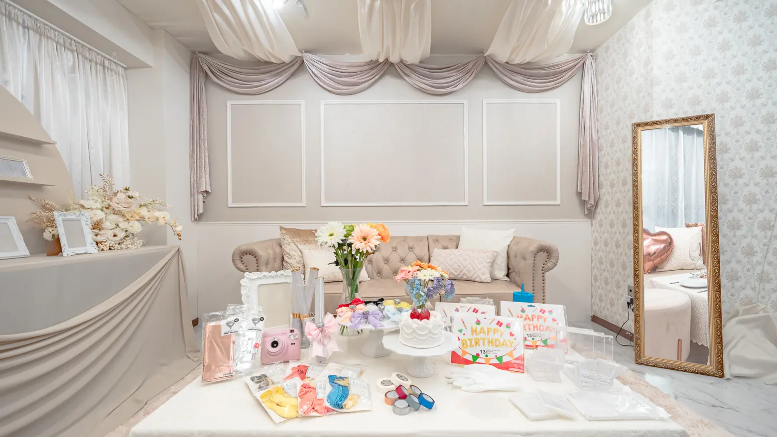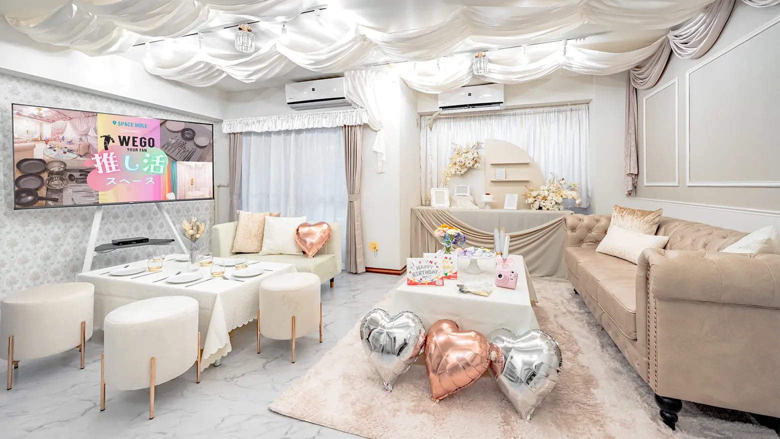 大きなソファやガーリーなドレッサーを設置することで映え写真を撮影することができ、推し活をしながらホカンス気分を味わえます。ホワイト×ベージュのペールトーンベースで統一された空間は、どの推しカラーにも映えます。