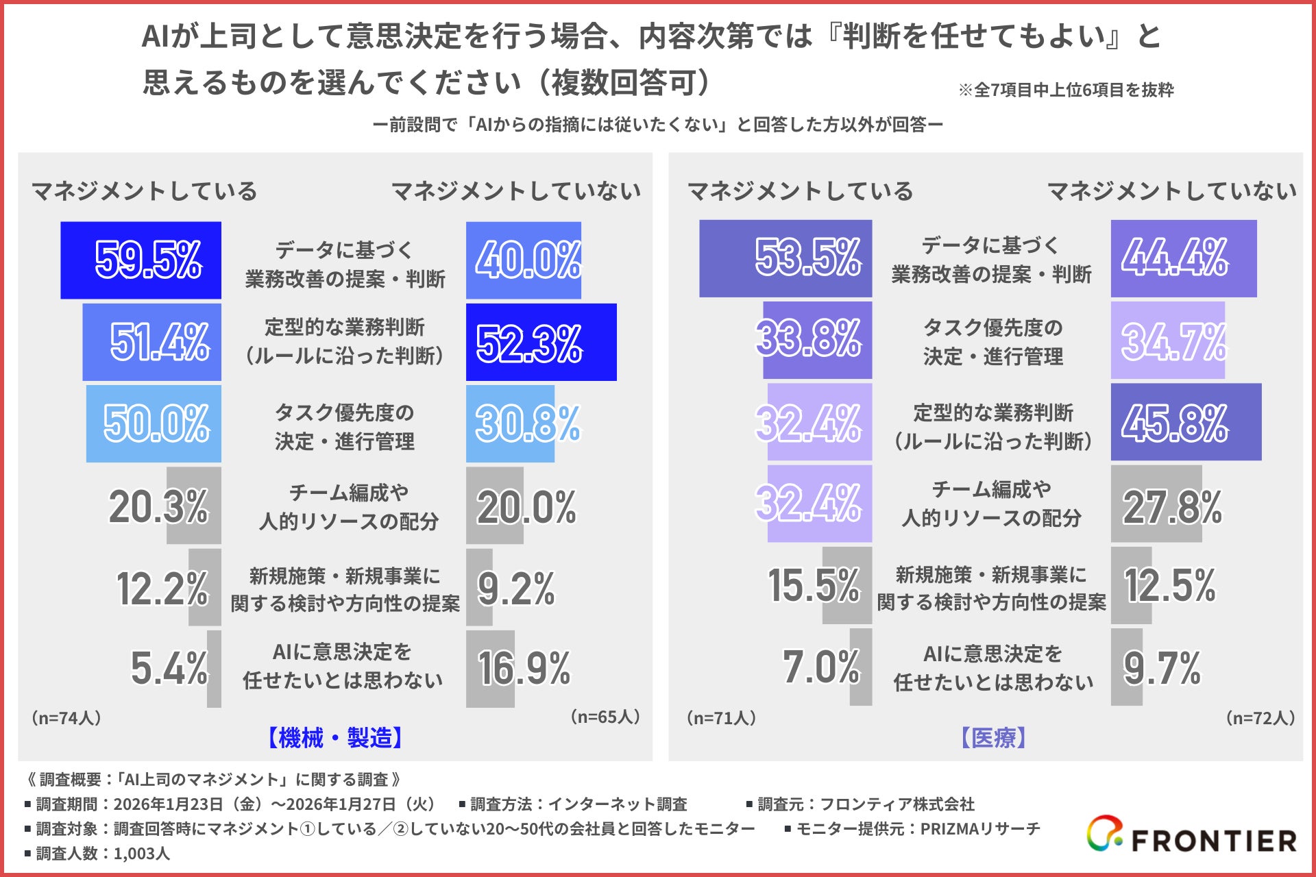 フロンティア株式会社(本社:東京都渋谷区、代表取締役社長:高橋 政裕)は、20〜50代の会社員1,003名を対象に、「AI上司のマネジメント」に関する調査を行いました。