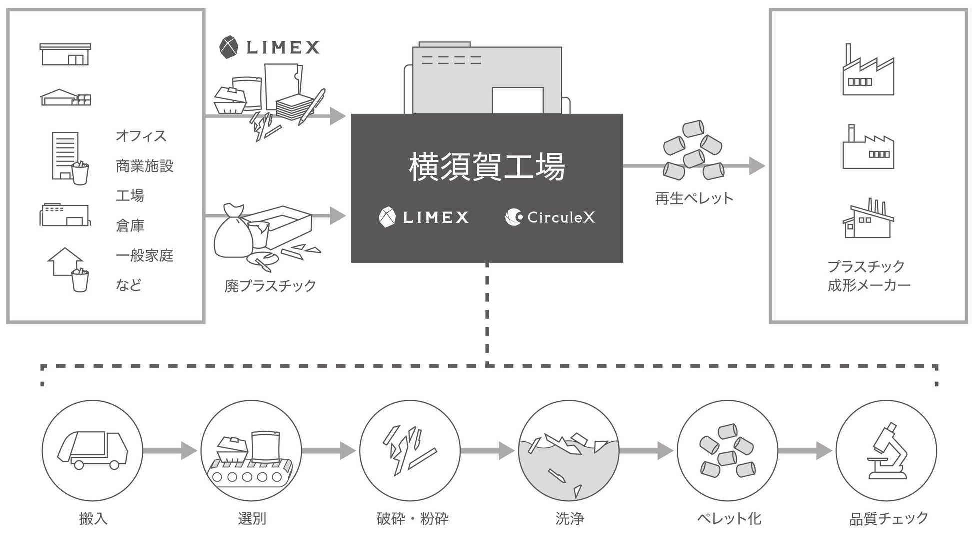 家庭から排出される使用済LIMEXと汎用プラスチックを一括回収し、工場内で自動選別してそれぞれ再生ペレットを製造する横須賀工場をモデルケースとして、廃プラスチックの処理を焼却・熱回収に頼る国内各エリアに拡大していきます。また、家庭におけるプラスチック分別の仕組みが未発達な海外エリアに対しても、リサイクルシステム構築の解決策として本スキームを展開していく計画です。