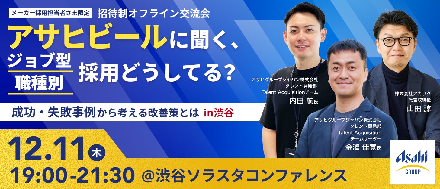 博士人材をはじめとする大学院生・研究者の新卒・中途採用支援を行う株式会社アカリク(本社:東京都渋谷区、代表取締役:山田 諒、以下 アカリク)は、2025年12月11日(木)、アサヒグループジャパン株式会社(以下 アサヒグループジャパン)よりゲストスピーカーをお招きし、メーカー企業の人事・採用担当者を対象とした限定招待制のセミナー「アサヒビールに聞く、ジョブ型/職種別採用どうしてる?成功・失敗事例から考える改善策とは」を、渋谷ソラスタコンファレンスにて開催いたしました。