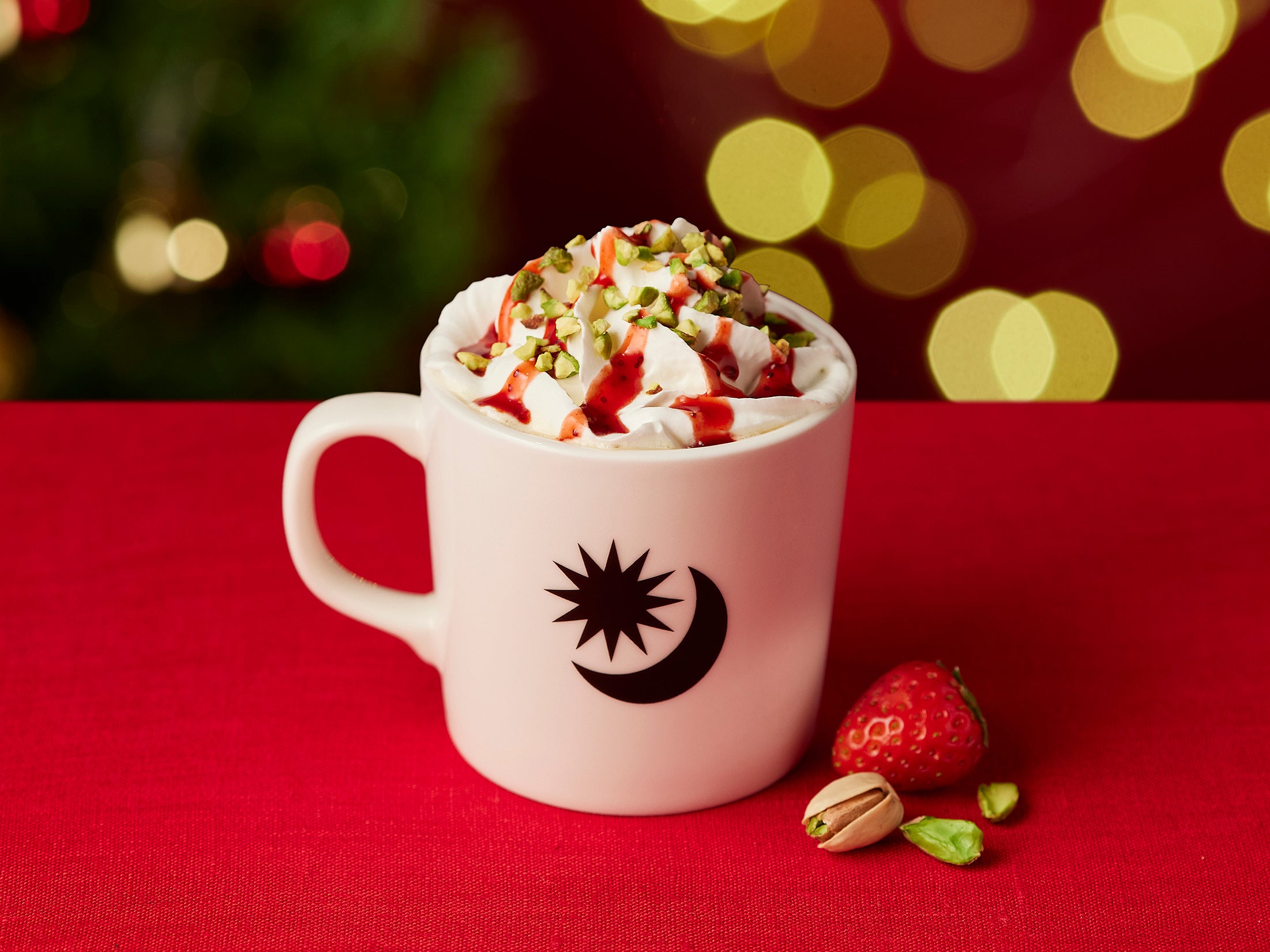 濃厚でクリーミーな味わいのピスタチオ入りホワイトチョコソースを合わせたミルクにエスプレッソを加え、甘酸っぱいストロベリーソースと香ばしいピスタチオをトッピングしました。グリーンのピスタチオと赤いベリーソースが織りなすクリスマスカラーの一杯で、冬の特別なひとときを過ごしませんか?一年に一度訪れるこの特別な季節に、「ベリー&ピスタチオモカ」をぜひお楽しみください。