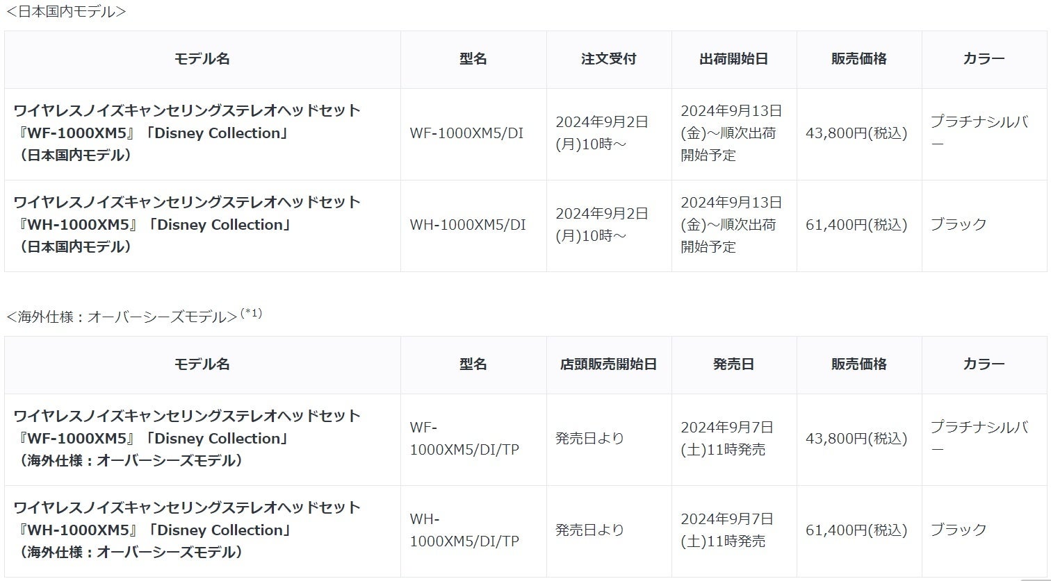 ソニーマーケティング株式会社は、Disneyのキャラクターデザインを刻印した限定デザインのワイヤレスノイズキャンセリングステレオヘッドセット『WF-1000XM5』『WH-1000XM5』の注文受付を本日9月2日(月)から開始します。