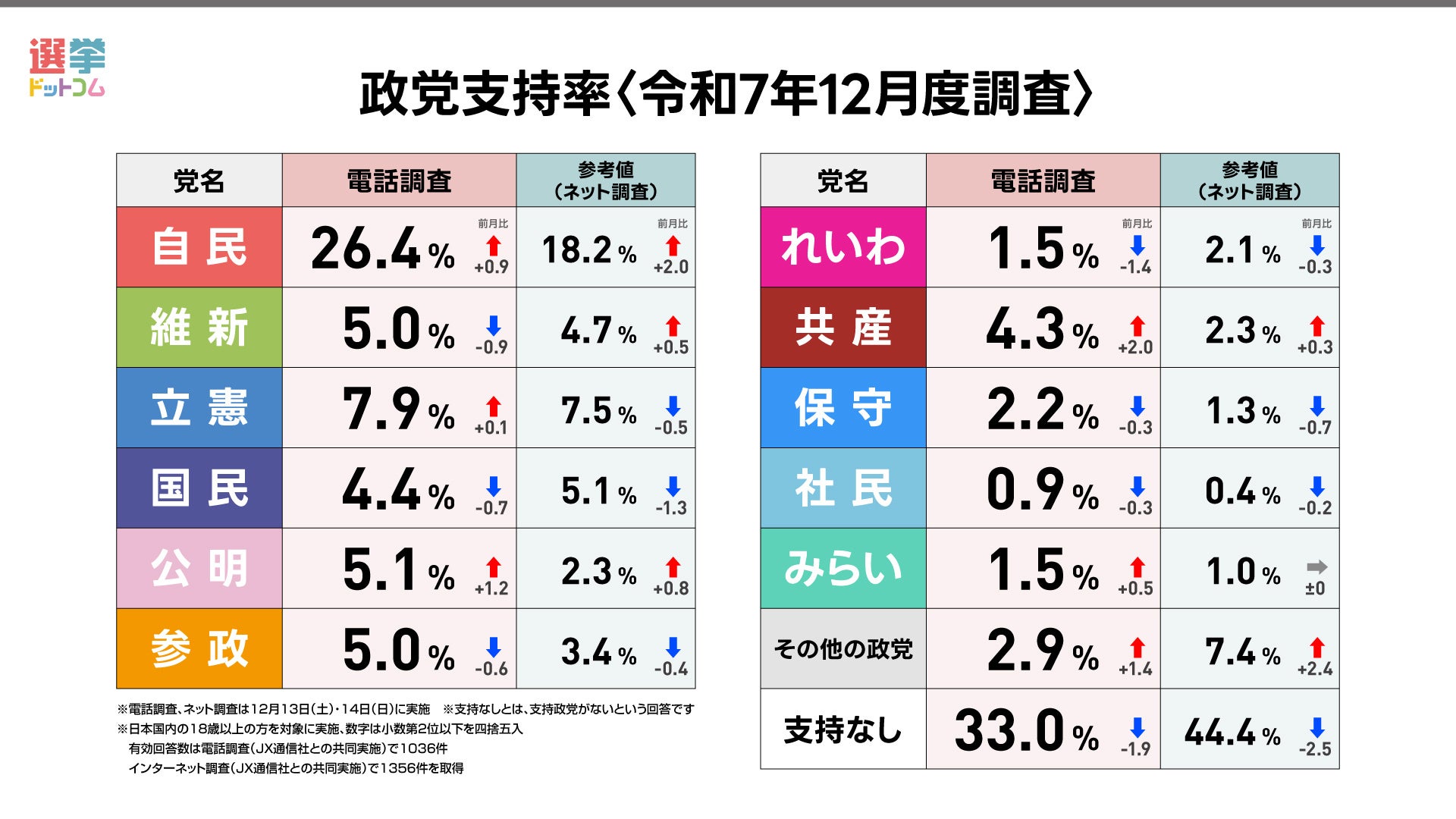 高市内閣支持率7割に上昇!比例投票先で与党が伸びる一方、野党勢力は?2025年12月電話×ネット意識調査