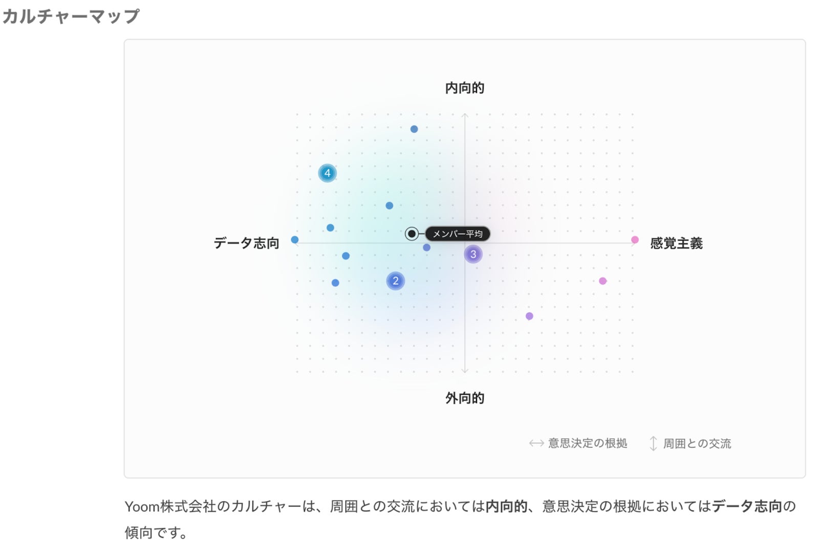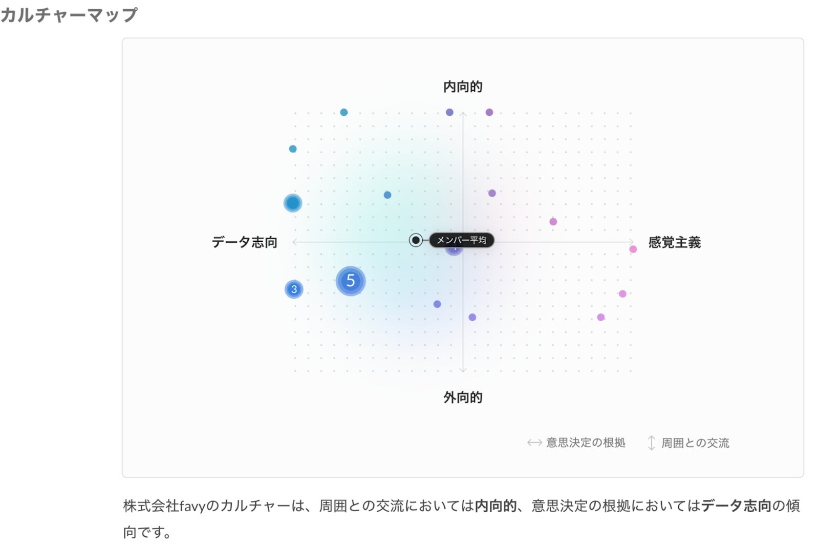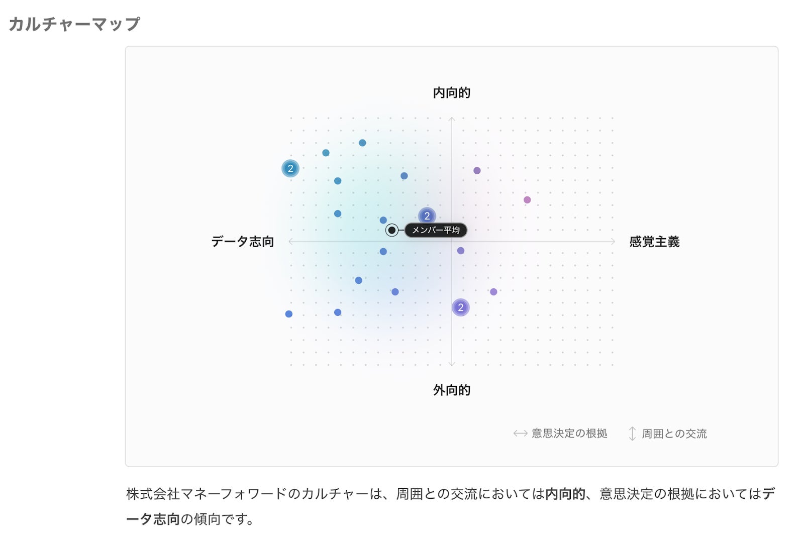 マップは、当社が提供している「性格診断」の結果をもとに作成します。「周囲の交流(内向的or外交的)」と「意思決定の根拠(データor感覚)」の2軸4項目で構成された散布図上に、メンバーがどの位置に該当するかを、ドットで表します。また結果の平均値をもとに、カルチャーの傾向の言語化も行います。