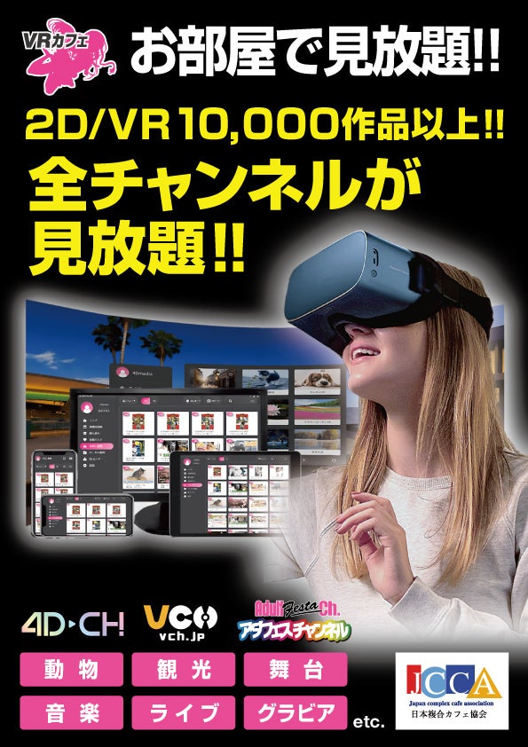 VRカフェでは「動物」「観光」「舞台」「音楽」「ライブ」「グラビア」等、様々なコンテンツを2D/VR映像として楽しむことができるVR視聴専用サイトです。