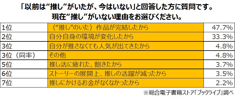 【4】 一方、「推し活をやめた」という人は全体の10.3%、きっかけは「作品が完結したから」が約半数で最多、「推し活をやめた」理由には、「キャライメージの変化」「性格が変わってしまった」などのコメントも。