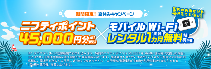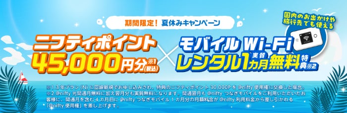 ニフティ、「@nifty光」申込者を対象に「夏休みキャンペーン」を実施~LTE対応Wi-Fiレンタル「@nifty つなぎモバイル」回線開通月+1カ月分が実質無料に~