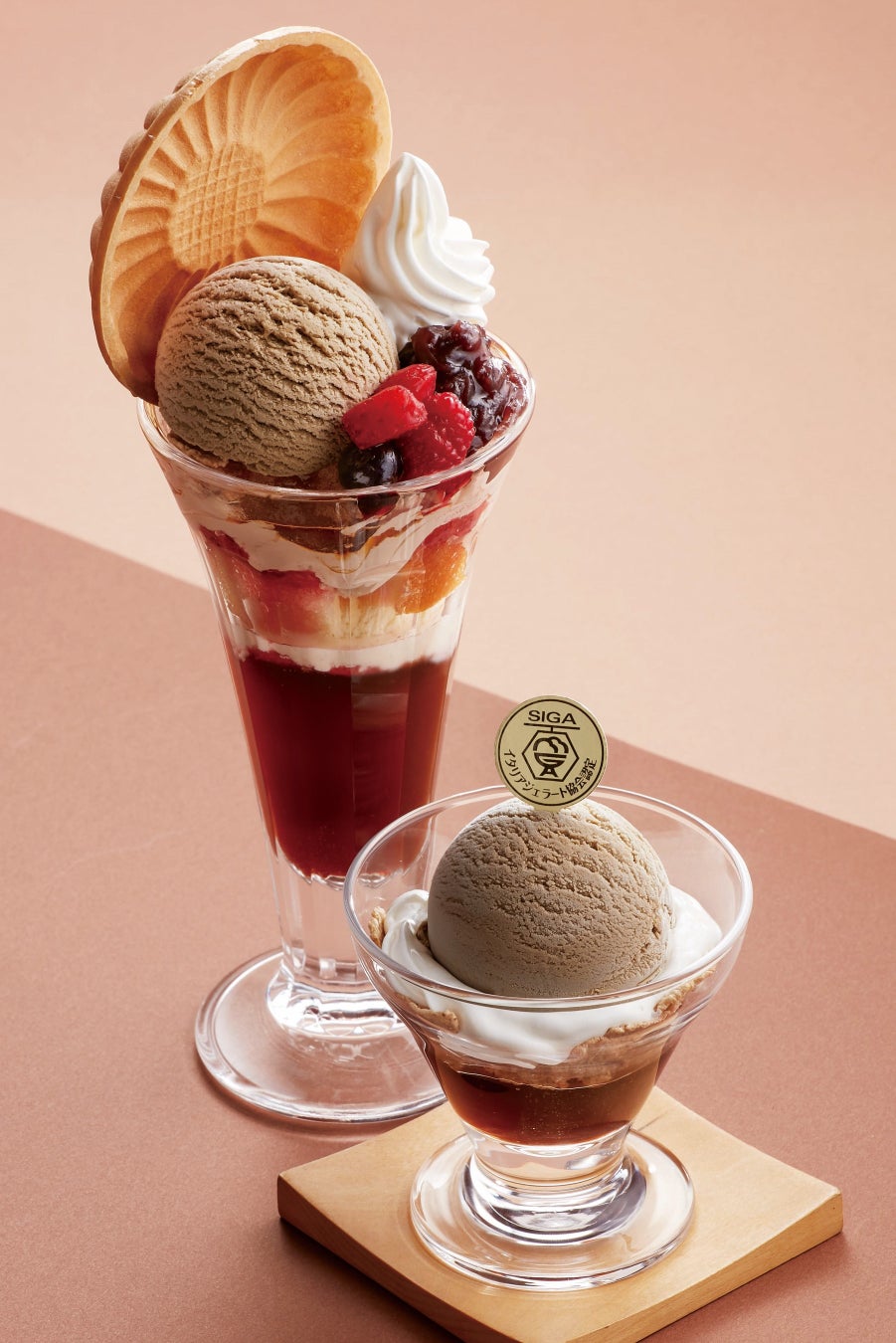 ・一番摘みほうじ茶アイスのミニパフェ/369円(税込405円)*画像右