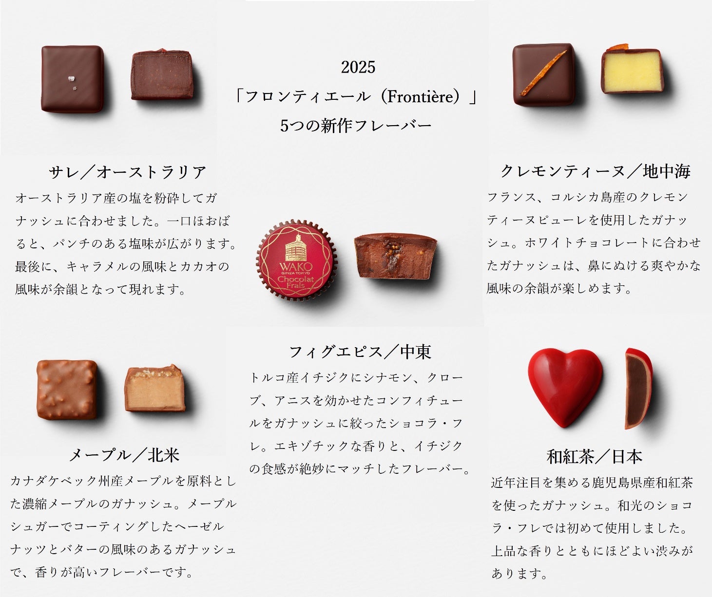 創業以来、和光は世界中へ、境界(Frontière)を超えて常に良いものだけを探し求める開拓者*(Frontière)。“Frontière”のDNAを受け継ぐ、和光のショコラティエが世界中から探し求めた、最高の素材を使ったショコラ・フレに昇華しました。