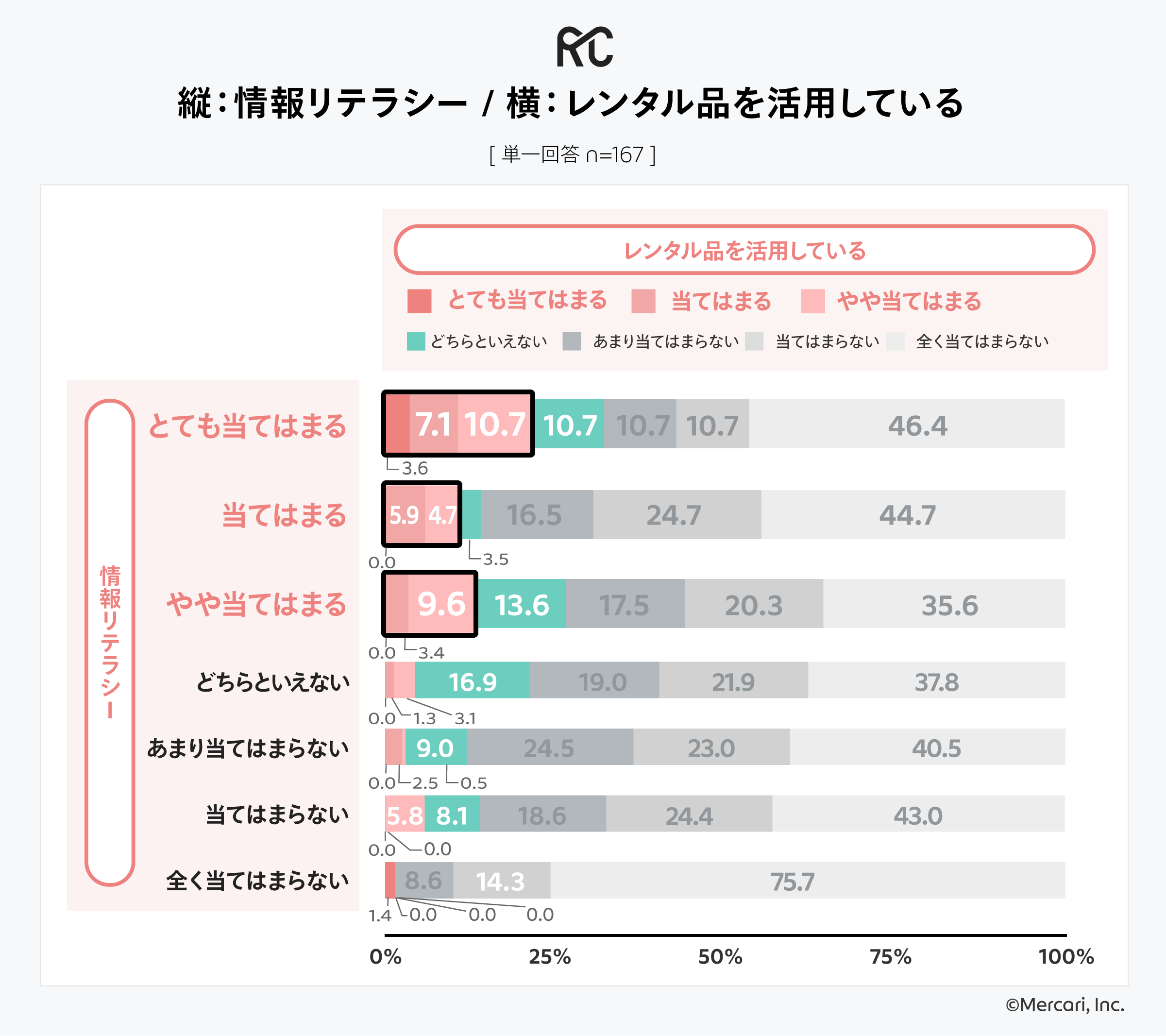 「情報リテラシーが高い」と回答した人は、そうではない人と比べて、「セール品やアウトレット品を主に買い、定価ではほぼ買わない」「リユース品やレンタル品を活用している」「自分はよい買い物をしていると感じることが多い」の回答する割合が高い。また、リセールバリューを意識した買い物への満足度が高い傾向も明らかに。情報を収集・取捨選択することで、“定価で買う”以外にもリユース・レンタル品を活用するなど、“所有”“利用”に多様な選択肢があることから、自らの買い物に対する満足度も高いことが伺える。