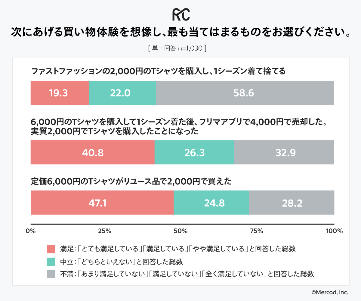 2,000円の買い物を、3つの異なるお買い物体験で比較検証を実施したところ、「1. ファストファッションで2,000円のTシャツを購入し、1シーズン着て捨てる」に満足と回答した人は19.3%。「2. 6,000円のTシャツを購入して1シーズン着た後、フリマアプリで4,000円で売却し、実質2,000円でTシャツを購入したことになった」に満足と回答した人は40.8%。「3. 定価6,000円のTシャツがリユース品で2,000円で買えた」に満足と回答した人は47.1%がという結果に。