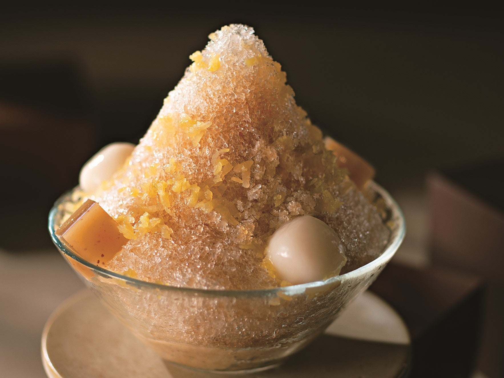 今年採れた栗を使った秋限定のかき氷。風味豊かな栗餡の上に氷を重ね、自家製の和三盆糖蜜をかけています。