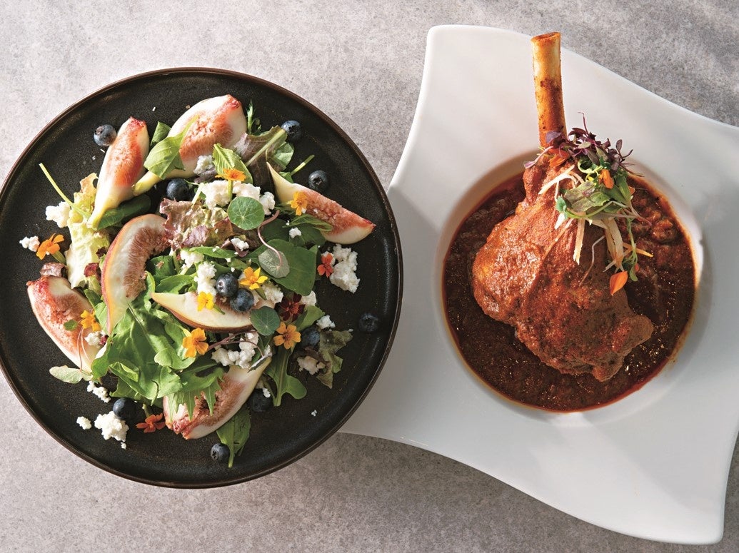 今秋のニルヴァーナのイチ推しはビリヤニ。秋茄子ときのこの秋の味覚をたっぷり使ったベジタリアン対応のひと皿です。彩り豊かなサラダはベビーリーフにいちじくとブルーベリー、フェタチーズをミックスしたNY風。
