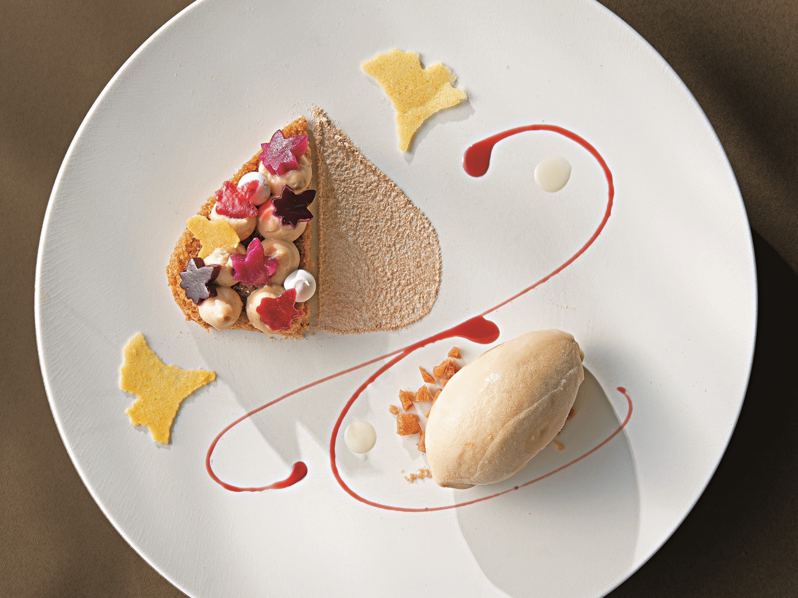 ほうじ茶の風味を利かせたスポンジの上にマロンムースと求肥を乗せたケーキ。パリパリとした焼き八ツ橋とほうじ茶アイス、カシスソースとトリュフ風味のはちみつを添えて。仕上げにウイスキー「山崎」をスプレーしました。