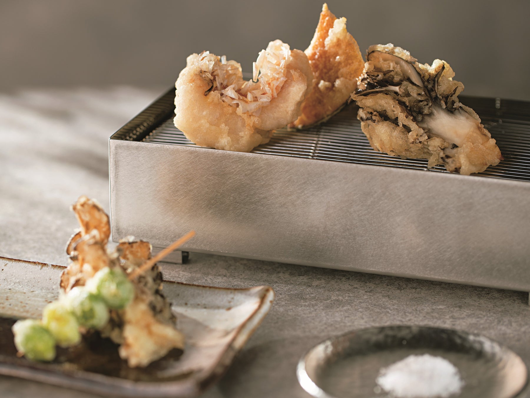 秋の味覚を堪能できる3種類の天ぷらは、愛媛県沖で水揚げされた赤甘鯛、神奈川県三浦産のかぼちゃ、新潟県産の希少な舞茸が味わえます(画像左)。手間ひまかけて仕込んだ先附(画像右)は、極上の鮑を旬菜とともに。8月にリニューアルオープンを果たし、天ぷらによく合う日本各地からの地酒も豊富に加わりました。
