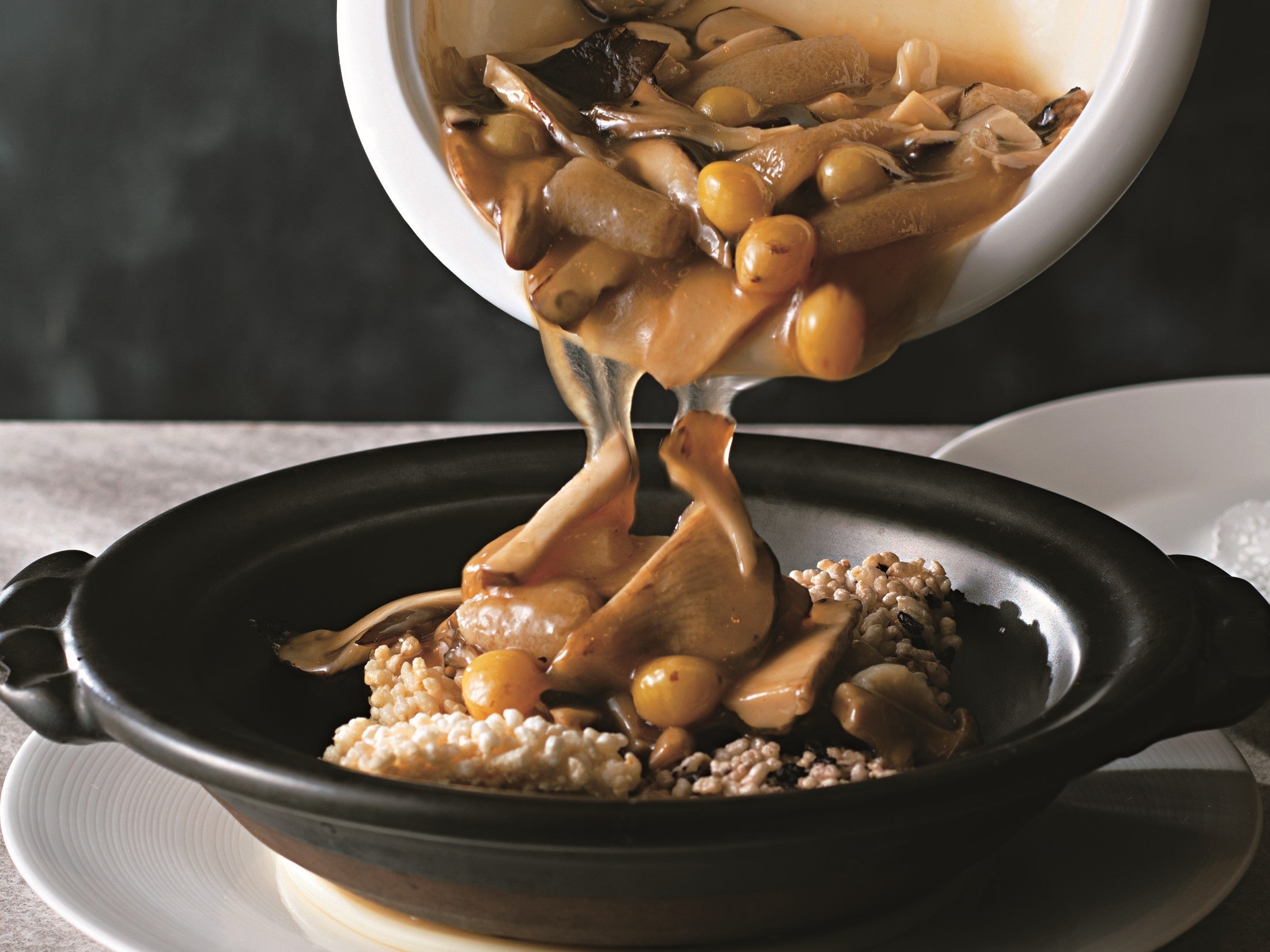 熱々に熱したおこげの上に、高級食材の雲南松茸をはじめとするきのこたっぷりの餡を乗せて。