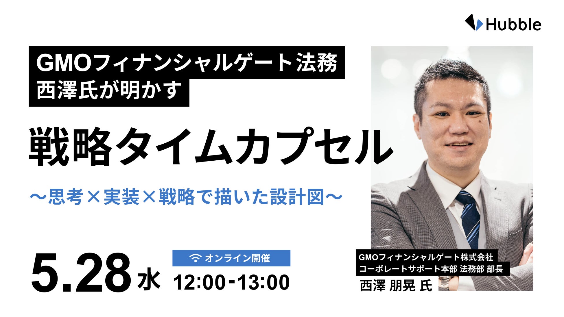 契約業務・管理クラウドサービス「Hubble(ハブル)」を提供する株式会社Hubble(東京都渋谷区、CEO:早川 晋平)は、GMOフィナンシャルゲート株式会社 法務部長の西澤 朋晃氏をゲストに迎えた無料オンラインセミナー「戦略タイムカプセル ~思考×実装×戦略で描いた設計図~」を、2025年5月28日(水)に開催いたします(※タイトルはセミナー趣旨に沿って表現しています)。