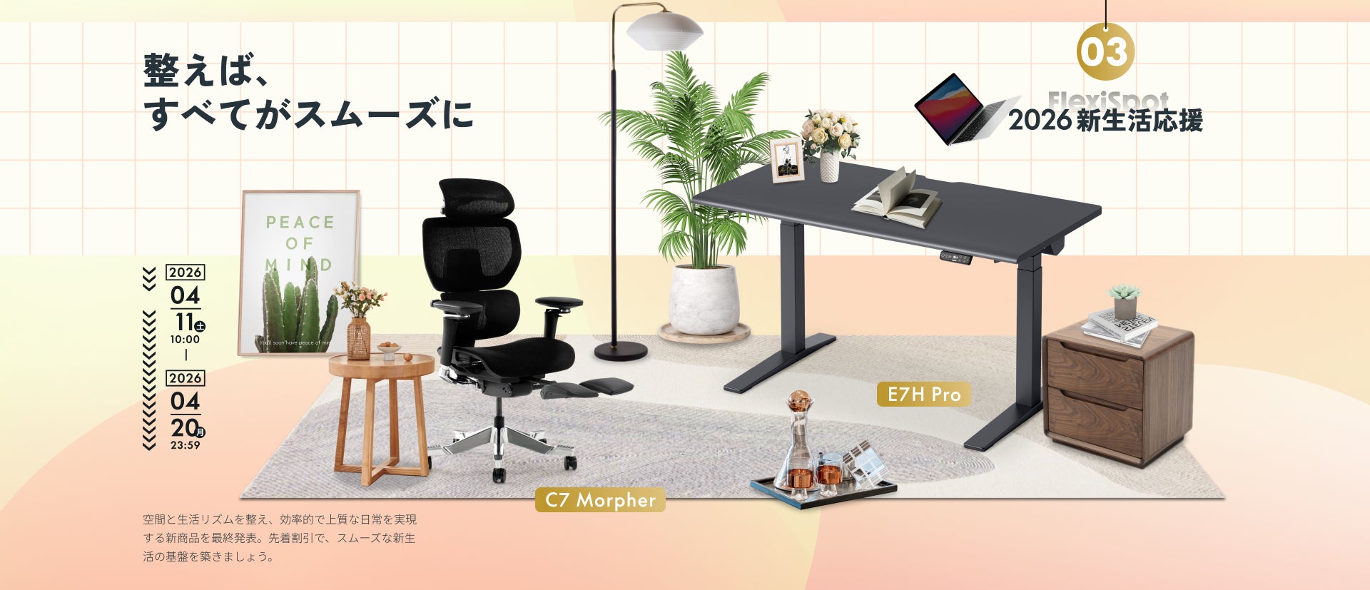Flexispot Japan株式会社(本社:埼玉県入間郡、代表取締役:斉冰白、以下「FlexiSpot」)は、2026年4月11日(土)より「新生活応援キャンペーン第3弾」を開催いたします。本キャンペーン期間中は、対象商品をお得な価格でご提供するほか、新作の昇降デスクおよびモニターアームが登場し、数量限定の特別価格にて販売いたします。