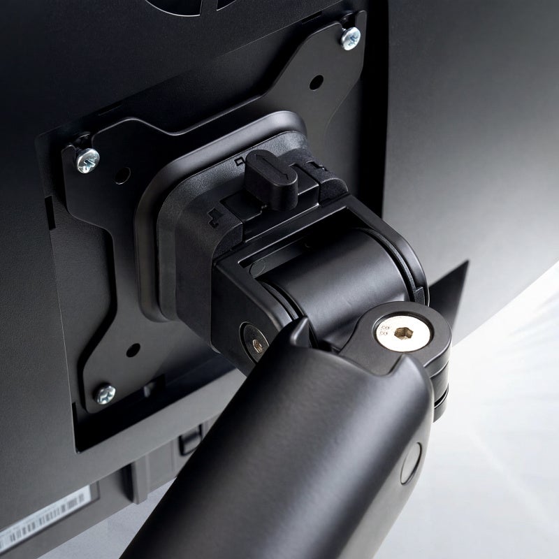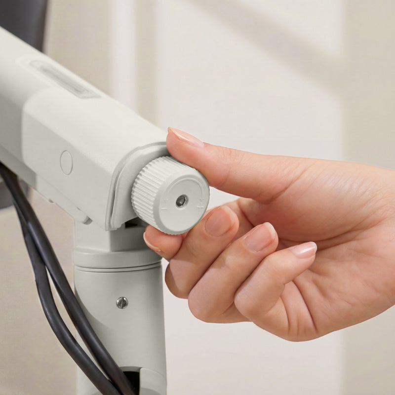 モニターアーム「MA6」は、操作性と安定性を兼ね備えたモデルです。5軸連動設計により、指一本でスムーズに動かせる直感的な操作性を実現し、狙った位置でしっかりと固定できます。工具不要で保持力の調整が可能で、調整状態を確認できる設計も採用しています。