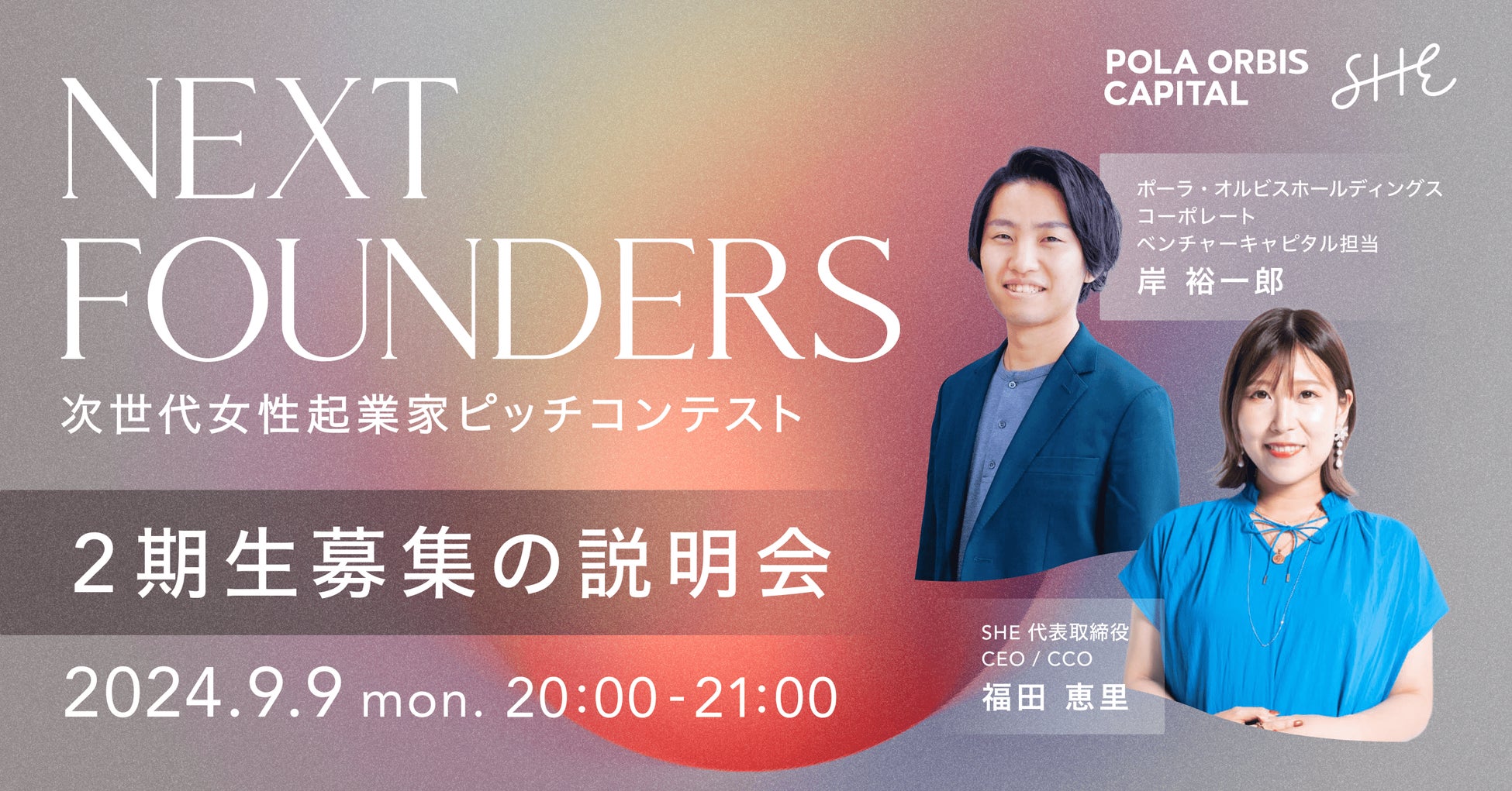 次世代女性起業家ピッチコンテスト「NEXT FOUNDERS」の応募を検討されている方に向けて、応募概要をご説明する説明会イベントを開催いたします。本プロジェクトの発起人であるSHE株式会社代表取締役の福田恵里とポーラ・オルビスホールディングスの岸裕一郎氏が登壇し、本プロジェクトのプログラム詳細や応募要項とともに、女性起業家輩出にかける想いをお話しいたします。