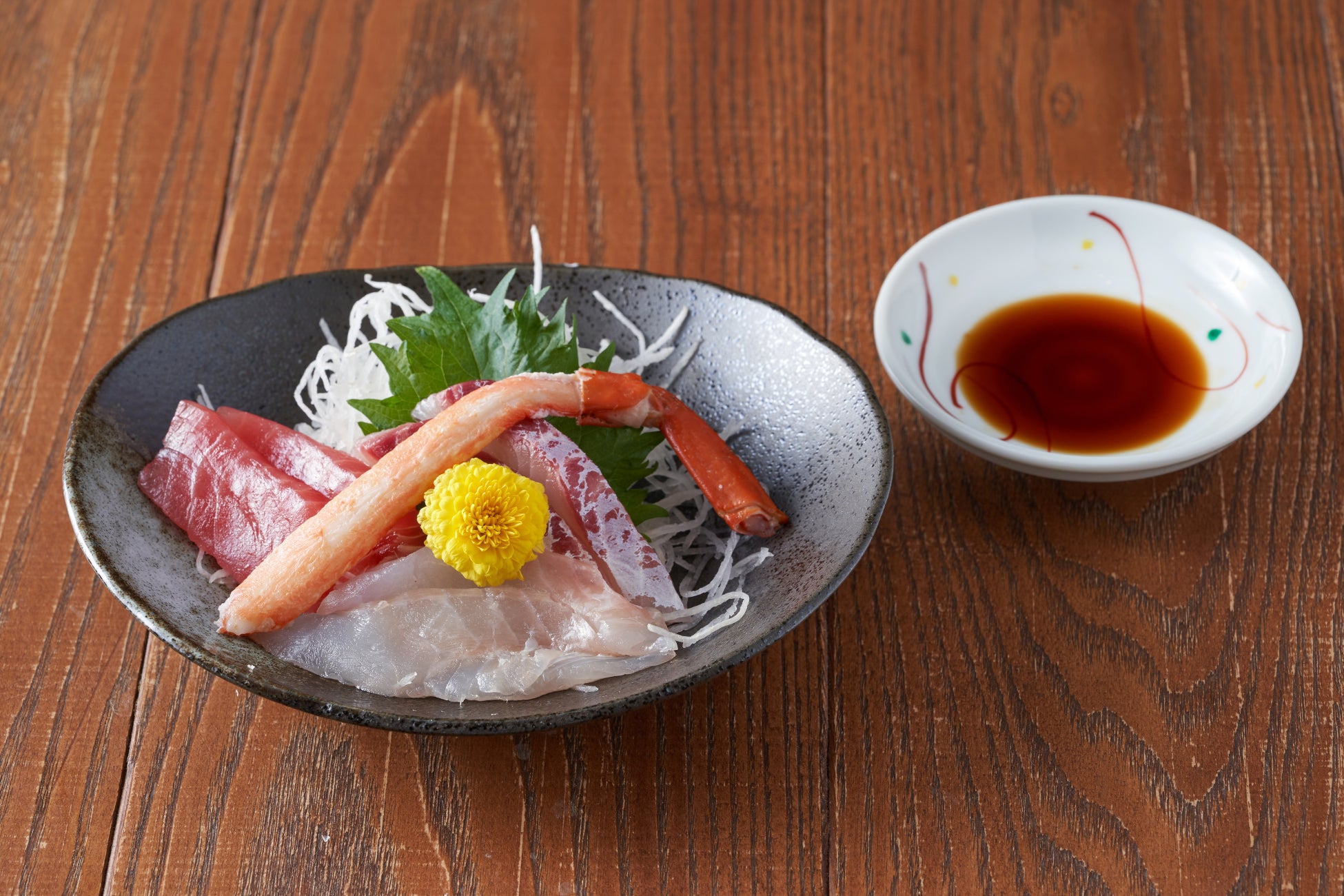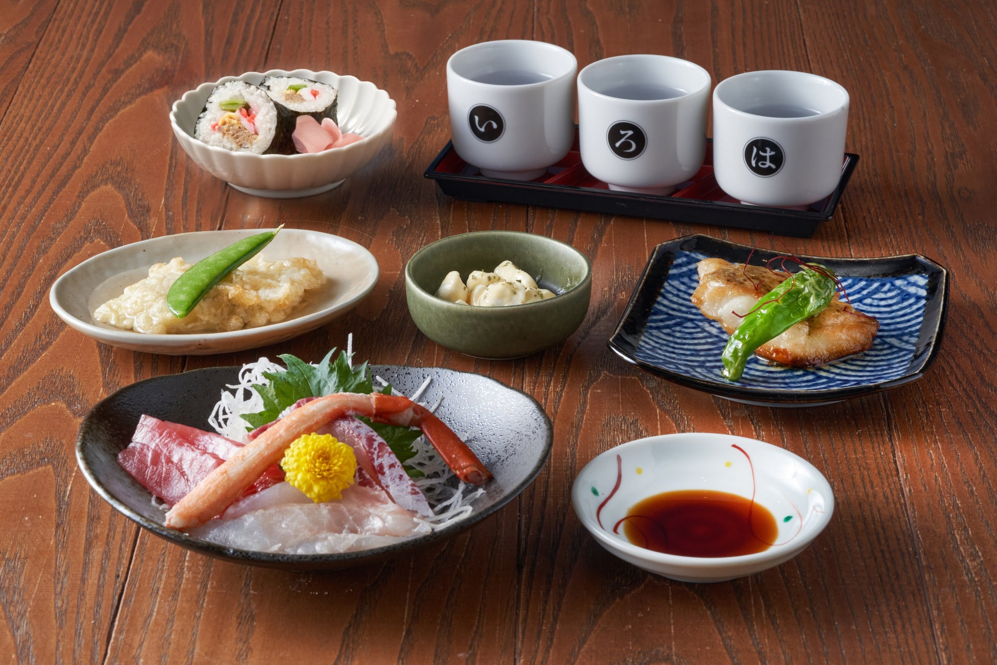 舞鶴漁港の仲買人の資格を持つ「サカナテラス」の店主が目利きした地魚と、北近畿エリアの酒蔵で作られた三種の日本酒の飲み比べが楽しめる『地肴コース』をご用意しました。日本酒と合う地魚のカニ味噌焼きや茹でカニ足と地魚のお造り、久美浜牡蠣の揚げ出汁、クリームチーズの西京漬け、丹後ばら寿司ロールと、「海の京都」らしい海の幸をふんだんに使用した料理をご提供します。地酒3種を飲み比べながら、新鮮な海の京都の魚をご賞味ください。