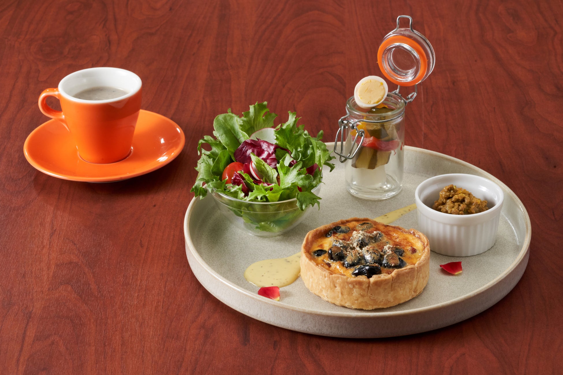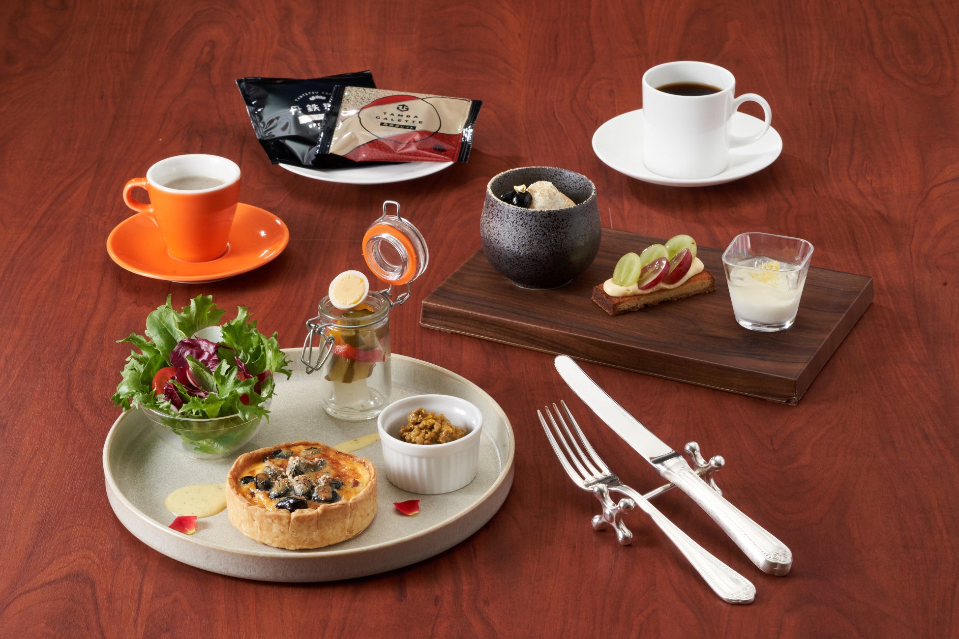 朝食プレートは、丹波黒豆を使用した黒豆と鴨スモークのキッシュと黒豆とマッシュルームのポタージュに、但馬牛と朝倉山椒のキーマカレーや但馬ピクルス、天滝ゆずのドレッシングを使用した地元野菜のサラダをワンプレートで提供します。デザートプレートは、黒豆珈琲と木下酒造の日本酒「タイムマシーン」を使用したティラミス、木下酒造の日本酒「人喰い岩」のジュレ&氷上牛乳のクリーム、季節のフルーツプチタルトの3品をお楽しみいただけます。