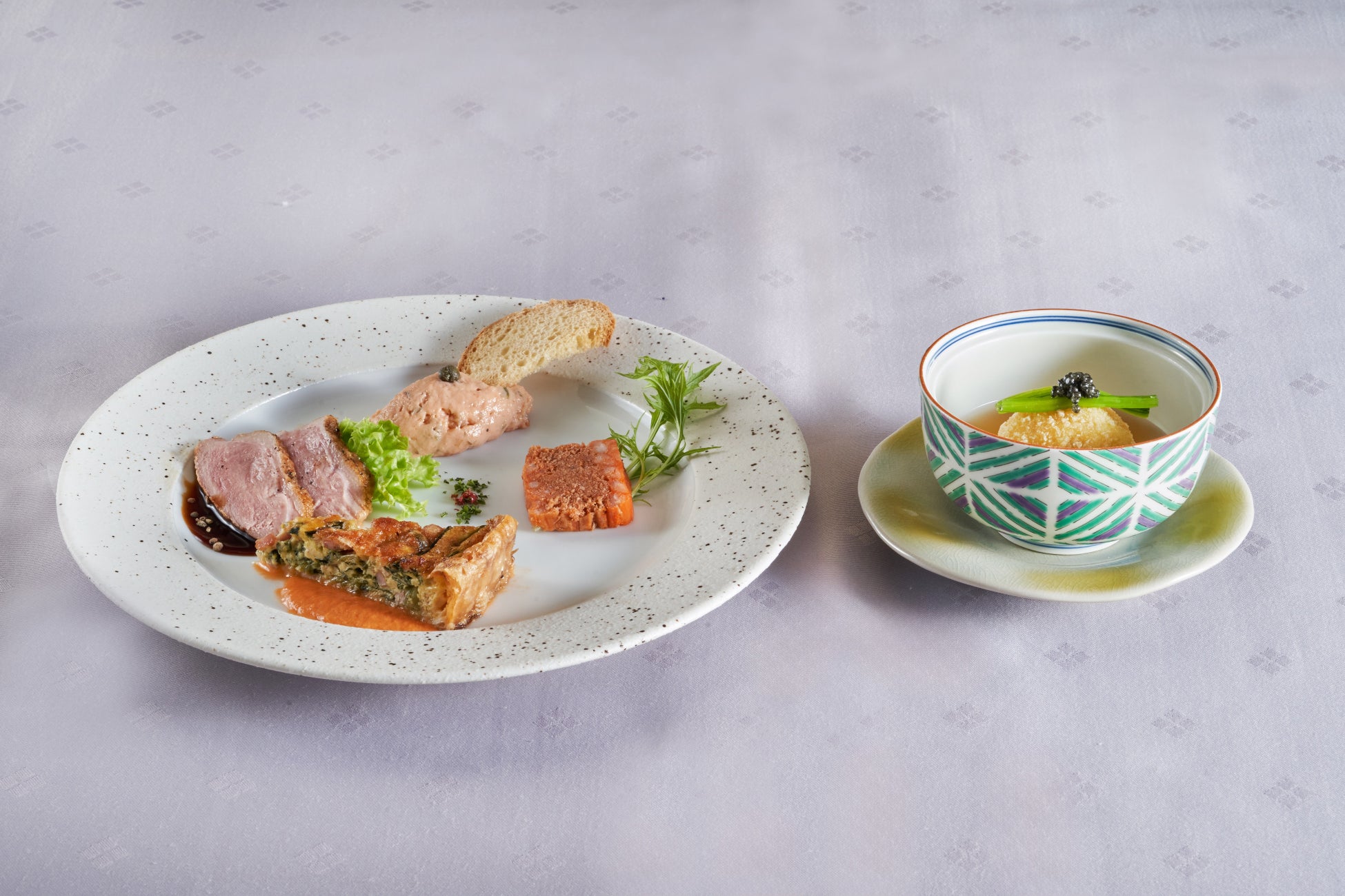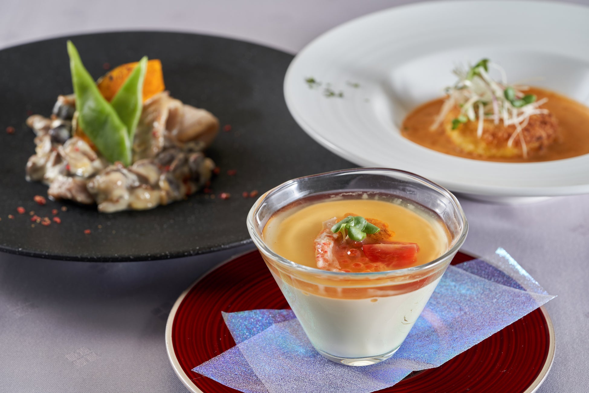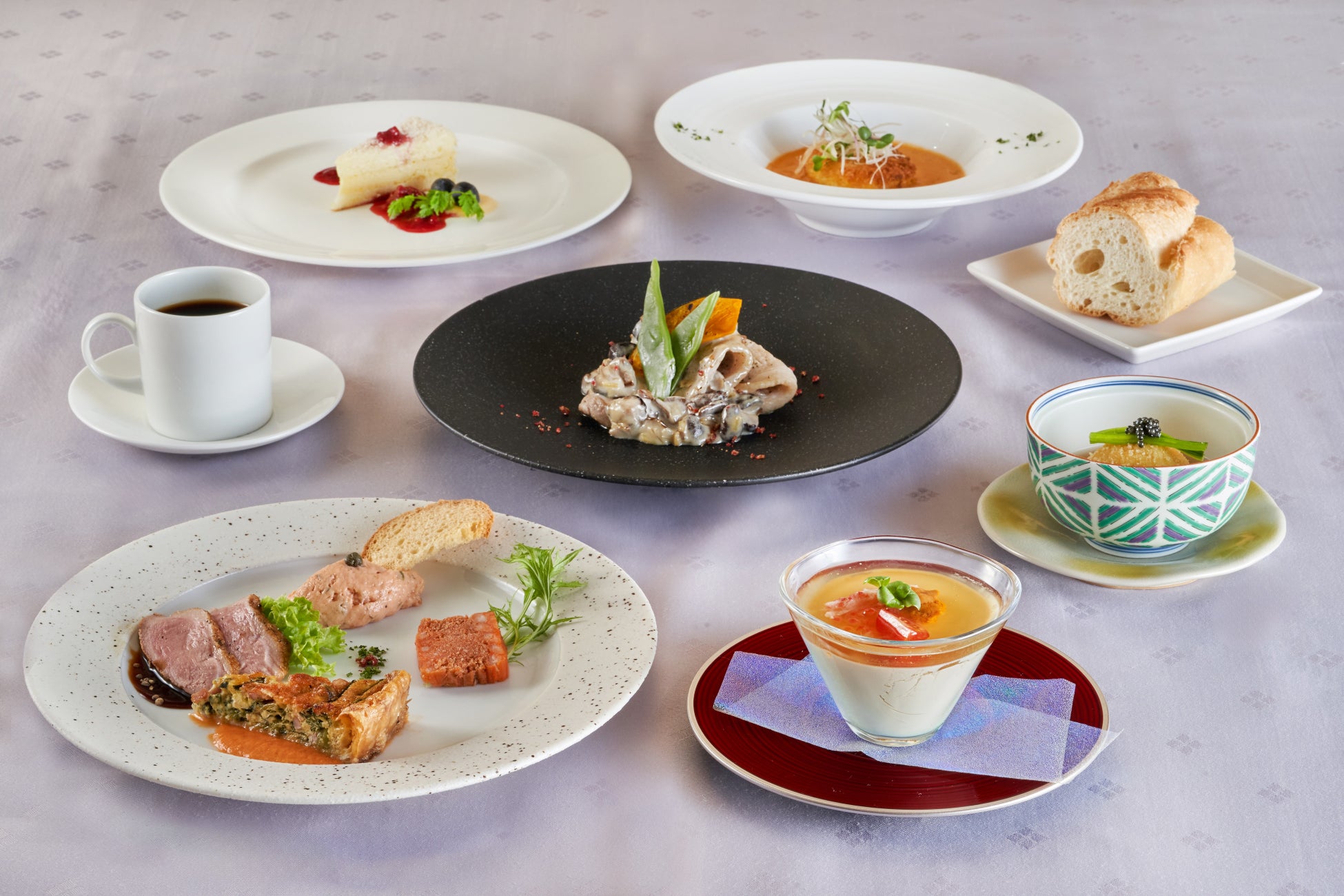 前菜は、セイコガニを蒸しあげたテリーヌや久美浜産のさつまいもを使用したさつまいも饅頭、スモークサーモンのパテ、鴨のローストフローレンス風キッシュの4品で、丹後の自然の恵みを感じる一皿です。また、メインは海の幸ムースのパン粉焼きの魚料理と、豚肉のクリームソースの肉料理をご用意しており、和と洋を織り交ぜた和洋折衷の料理をご提供します。